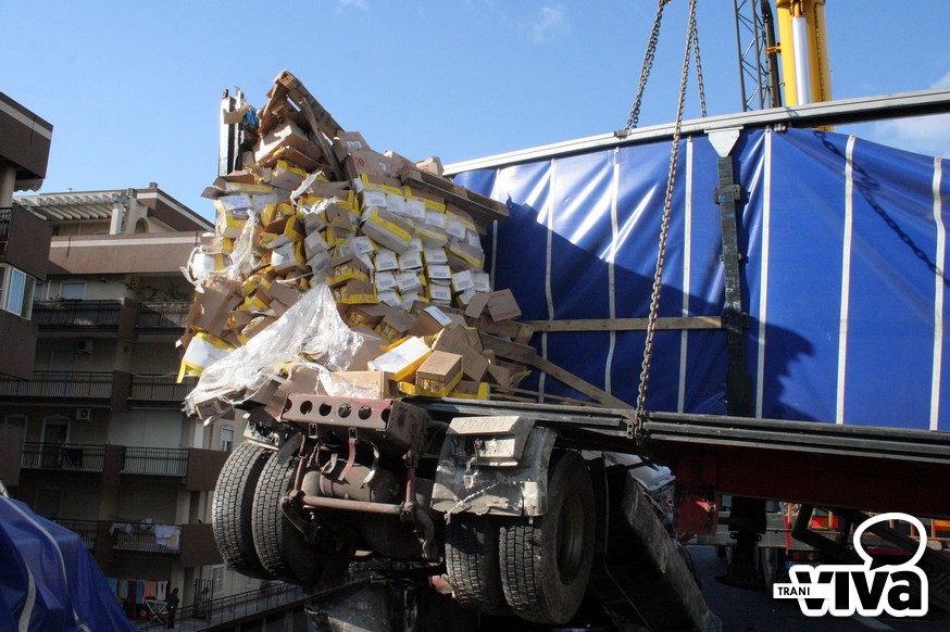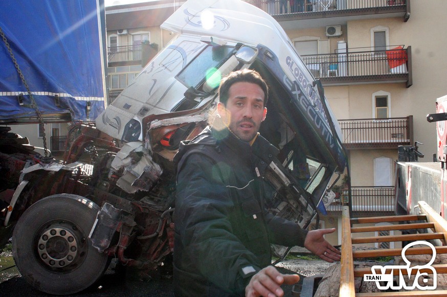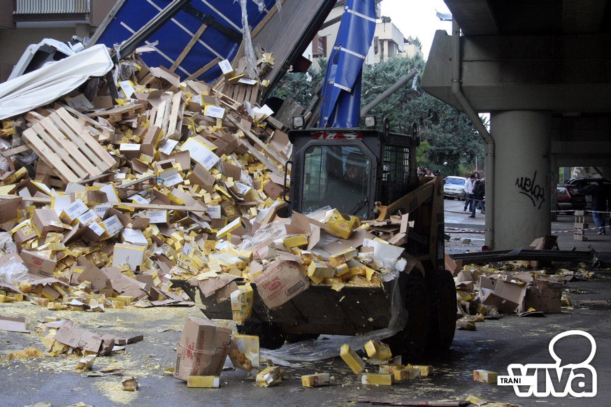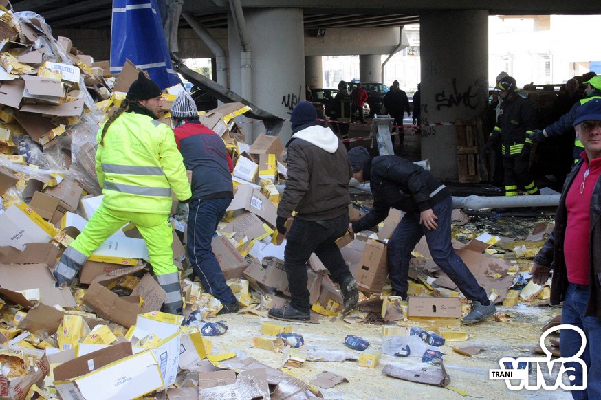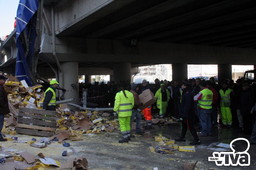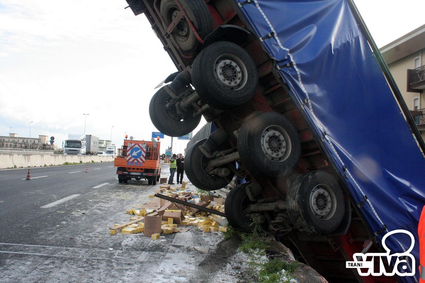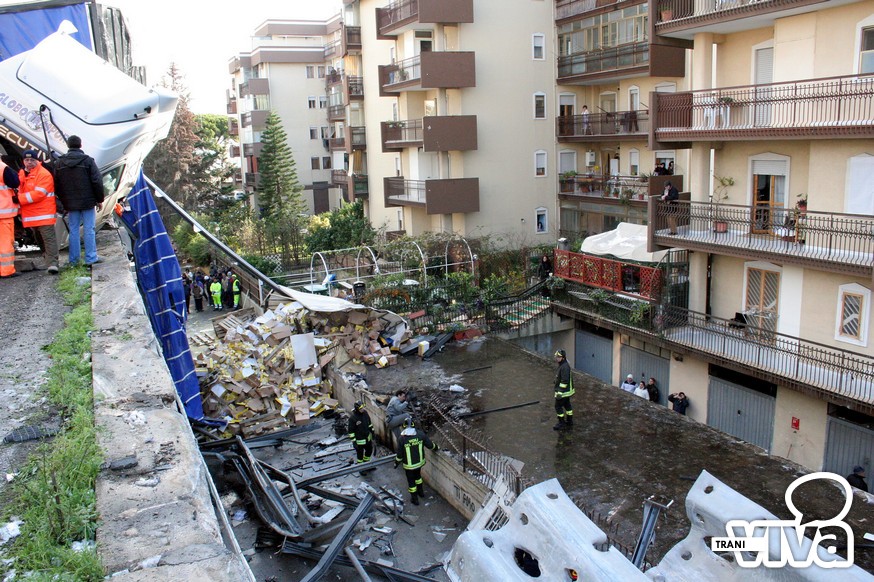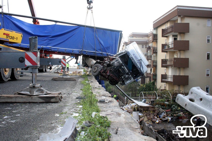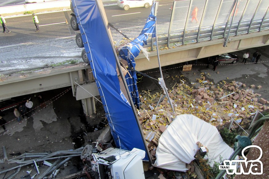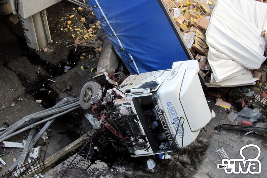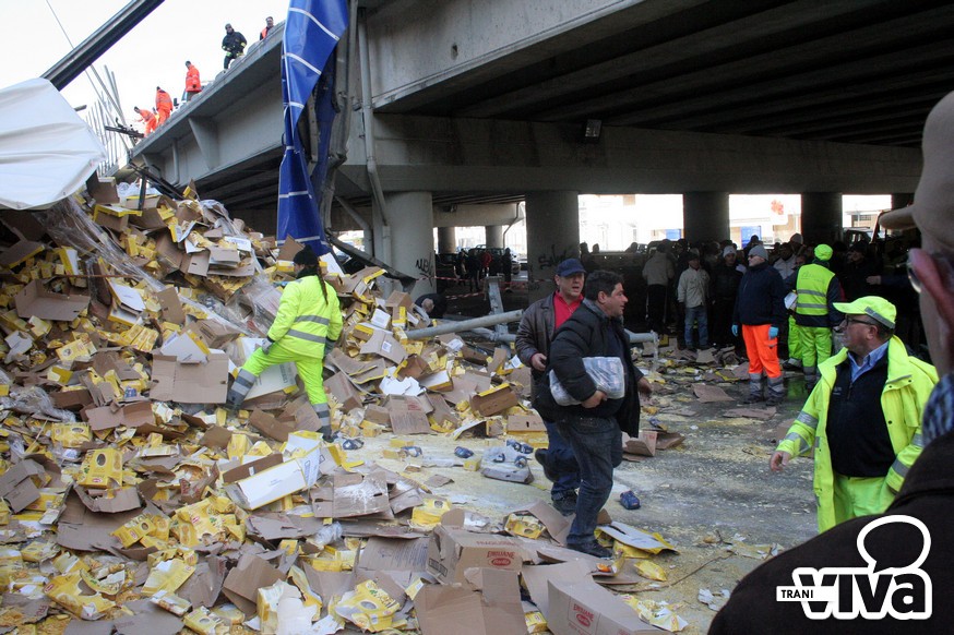 Un camion blu, contenente pasta, probabilmente a causa del manto stradale ghiacciato, ha sfondato il guard rail e le barriere anti rumore della statale 16 bis ed è rimasto in bilico per ore a strapiombo sulle abitazioni di via Cilea che si affacciano su via Superga. L'episodio si è verificato all'altezza di Trani centro, in direzione Bari.