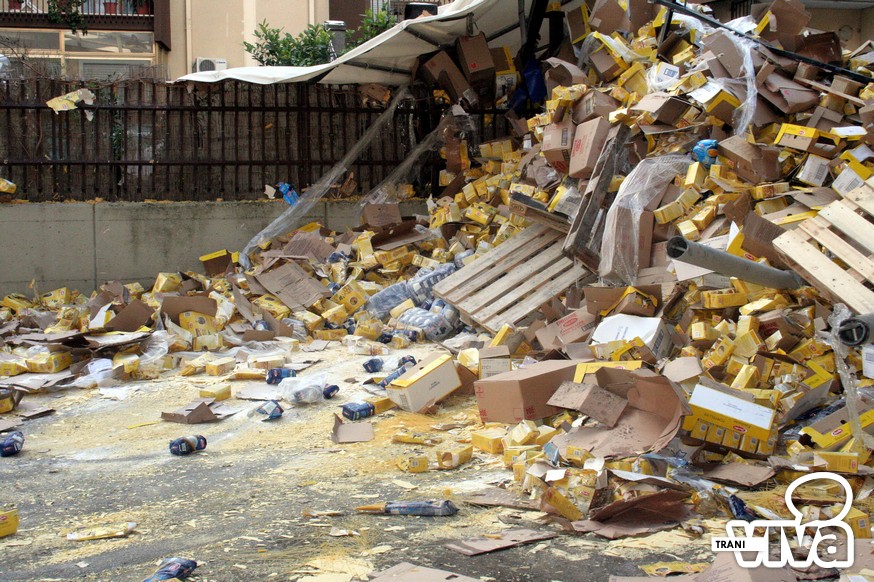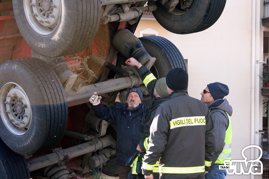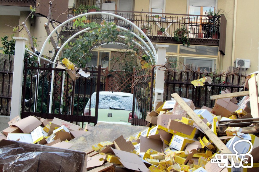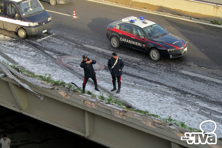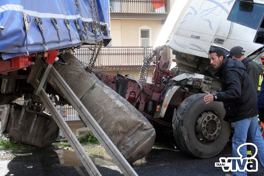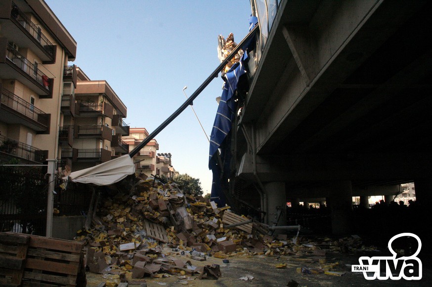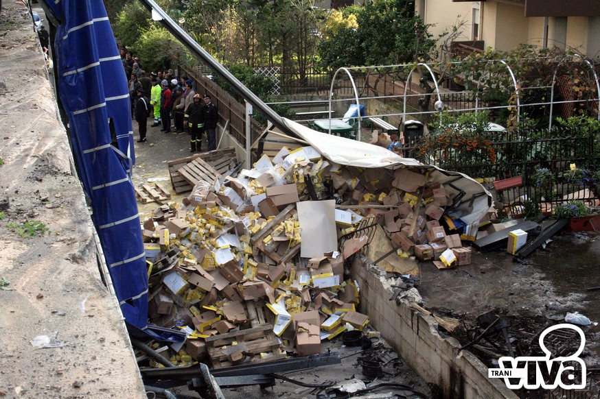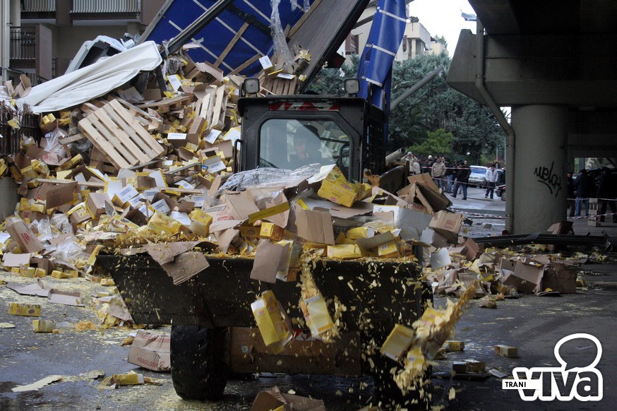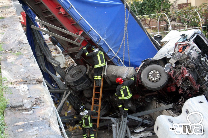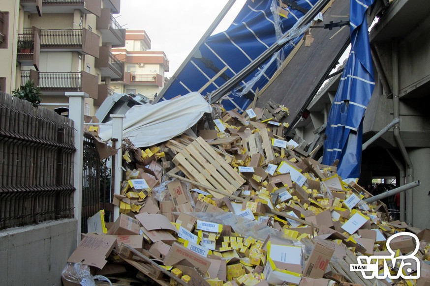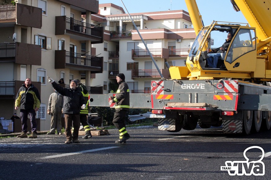 Un camion blu, contenente pasta, probabilmente a causa del manto stradale ghiacciato, ha sfondato il guard rail e le barriere anti rumore della statale 16 bis ed è rimasto in bilico per ore a strapiombo sulle abitazioni di via Cilea che si affacciano su via Superga. L'episodio si è verificato all'altezza di Trani centro, in direzione Bari.