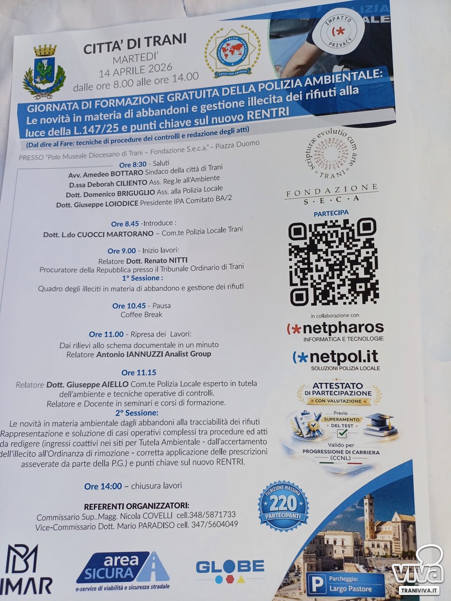 Si aprono questa mattina, martedì 14 aprile 2026, le porte del Polo Museale di Trani per ospitare uno degli appuntamenti formativi più attesi dagli operatori della Polizia Ambientale e dei servizi di vigilanza del territorio. Al centro del seminario, che si protrarrà dalle ore 8:00 alle ore 14:00, le profonde trasformazioni legislative che stanno ridisegnando il contrasto agli illeciti ambientali.