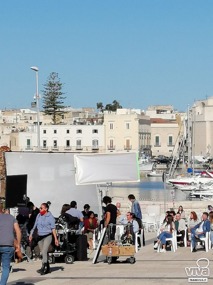Arrivando in piazza Quercia i tir di Cinecittà e i gazebo del catering denunciano la presenza dell'ennesimo set cinematografico che sceglie Trani: nel bel mezzo della piazza si sta registrando: numerosi i curiosi che assistono al ripetersi delle scene, seduti ai tavolini dei bar, mascherine comprese.