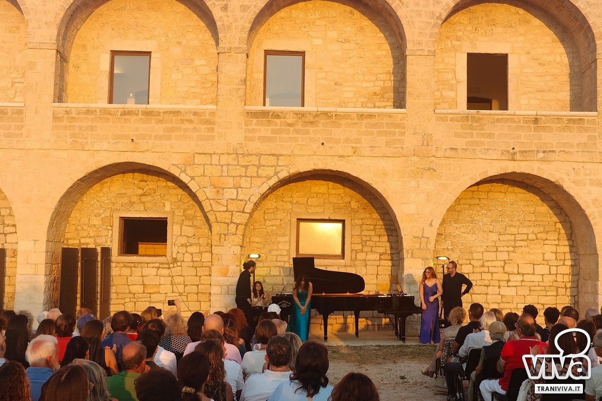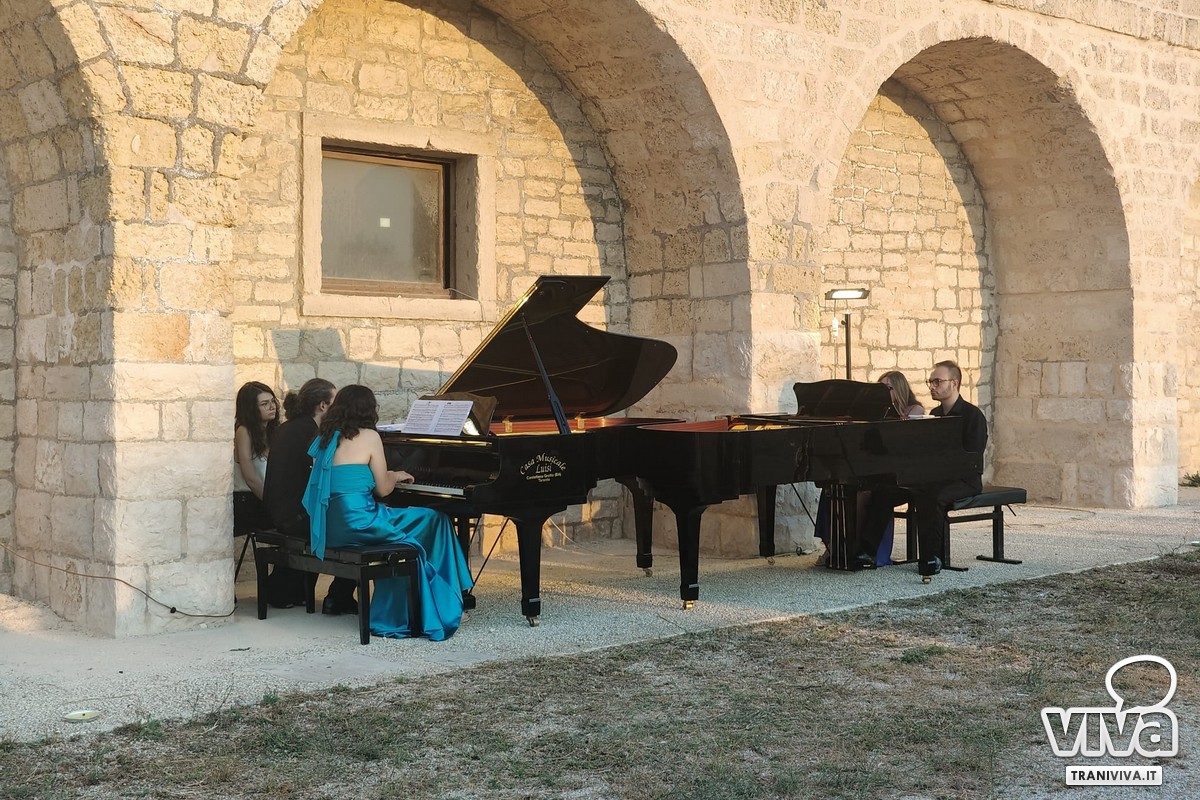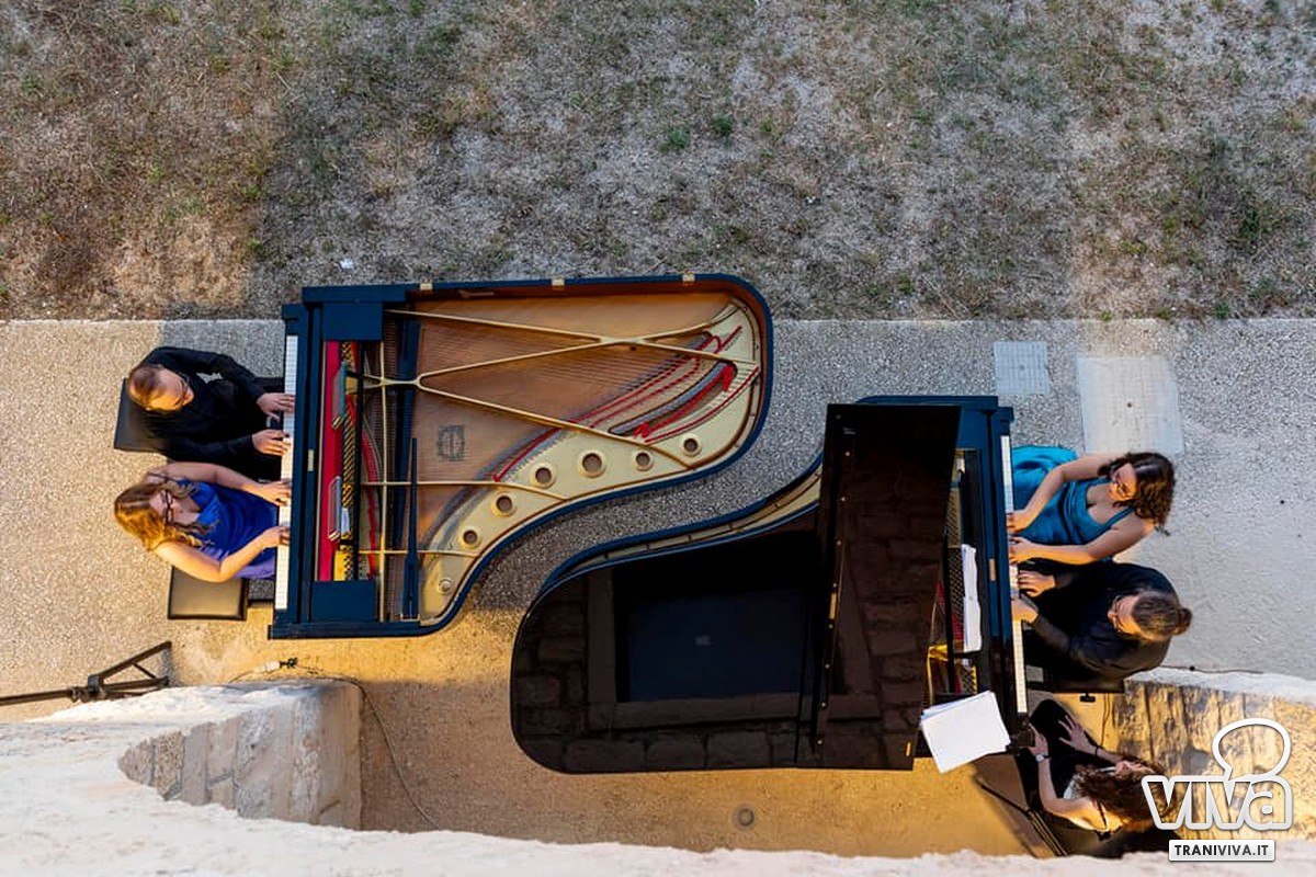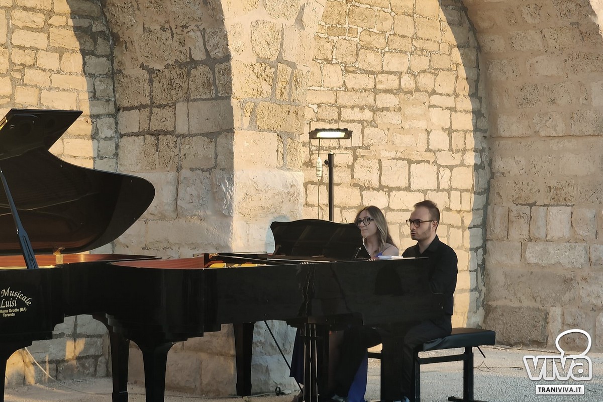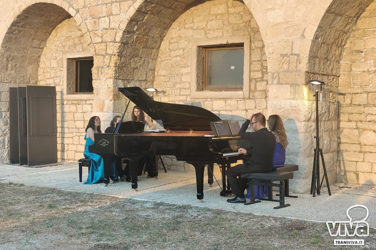 Quattro amici, otto mani e due pianoforti; sullo sfondo il monastero e la bellezza di un tramonto d'estate pugliese; protagonista è la musica. Si potrebbe riassumere così la serata di ieri, seconda tappa del "Trani Classic Festival", che ci accompagnerà fino alla fine di agosto. Ma c'è molto di più: la musica suonata nell'occasione di ieri è stata scelta accuratamente dai direttori artistici per essere compresa dal più vasto pubblico possibile, con l'intento di rendere accessibile la cultura a tutti, senza cadere nel cliché della musica come strumento di intrattenimento e rendendo il concerto gratuito, in modo da eliminare anche l'ulteriore ostacolo economico del pagamento del biglietto. L'esperimento sembra davvero riuscito: l'atmosfera più informale e familiare, come ha affermato Paolo Scafarella, direttore artistico del festival, unita alla bellezza del luogo, ha permesso di creare una bella connessione fra i musicisti e il pubblico.