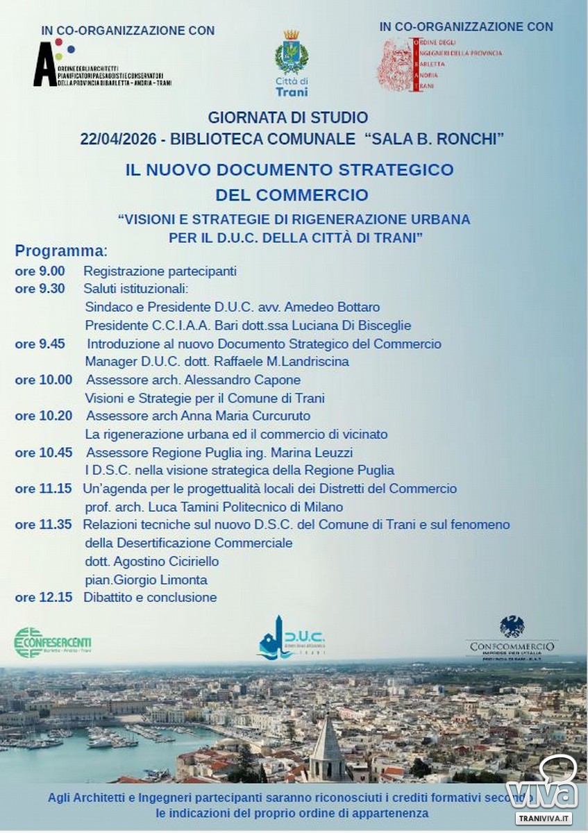 Trani si prepara ad ospitare una giornata ricca di appuntamenti, suddivisa in due segmenti nella giornata di mercoledì 22 aprile, per un confronto a più voci sul momento di profondo cambiamento che sta interessando il commercio a livello globale organizzata dal Distretto Urbano del Commercio di Trani con la coorganizzazione degli Ordini professionali di Architetti ed Ingegneri, impegnati nella prima parte del dibattito, con un parterre di ospiti illustri che discuteranno delle strategie e delle soluzioni possibili per il futuro del commercio di prossimità partendo dai due temi principali: la desertificazione commerciale e il documento strategico del commercio del Comune di Trani.