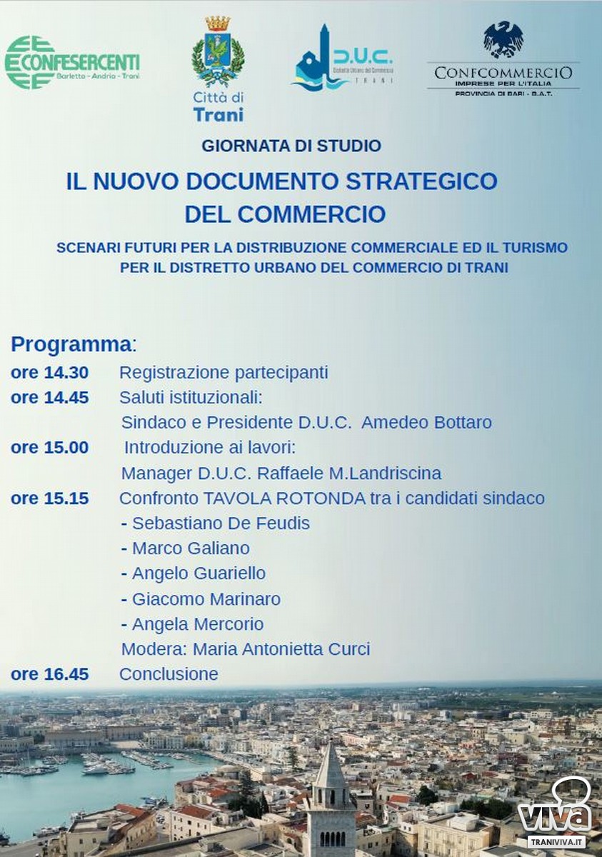 Nel primo pomeriggio, dalle 14:30, dopo un brunch ristorativo, sarà la volta del confronto tra De Feudis, Galiano, Guariello, Marinaro e Mercorio, i cinque candidati sindaco al Comune di Trani, chiamati a rispondere sugli stessi temi discussi in mattinata e ad illustrare progetti e programmi sullo scenario commerciale e turistico della comunità che ambiscono a governare. Moderato da Maria Antonietta Curci, il dialogo sarà introdotto da un focus particolare sulla distribuzione commerciale e il distretto urbano del commercio della città a cura del manager Raffaele M. Landriscina. All'incontro parteciperanno commercianti ed imprenditori della città, convocati sin dal mattino per discutere insieme i Documenti di Programmazione del DSC e della desertificazione commerciale, temi che allarmano molto gli esercenti dei negozi di vicinato, sempre più aggrediti dalla presenza della Grande Distribuzione Organizzata e dallo sviluppo sempre più invasivo delle vendite on line.
