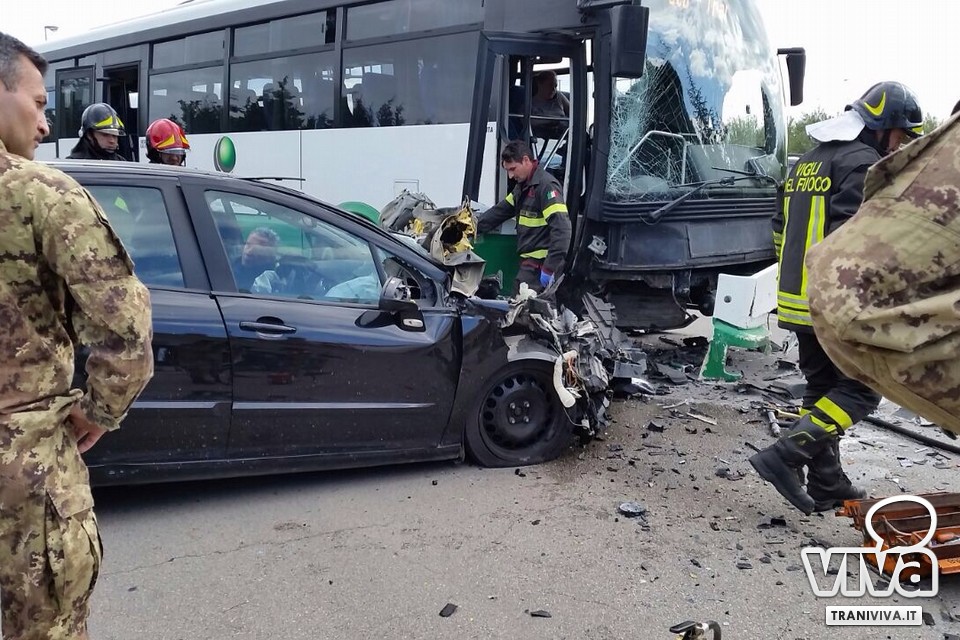 È successo pochi minuti prima delle 17. Sulla strada 378 tra Trani e Corato, un'auto, che viaggiava in direzione Corato, si è scontrata con un pullman di linea che, al contrario, si stava dirigendo a Trani. A guidare la vettura, ora completamente distrutta, una ragazza che ha riportato diversi traumi da strada. Cosciente, è stata subito trasportata in ospedale. Sul posto sono immediatamente intervenuti i vigili del fuoco, che hanno provveduto ad aiutare la ragazza ad uscire dall'auto, e i carabinieri.