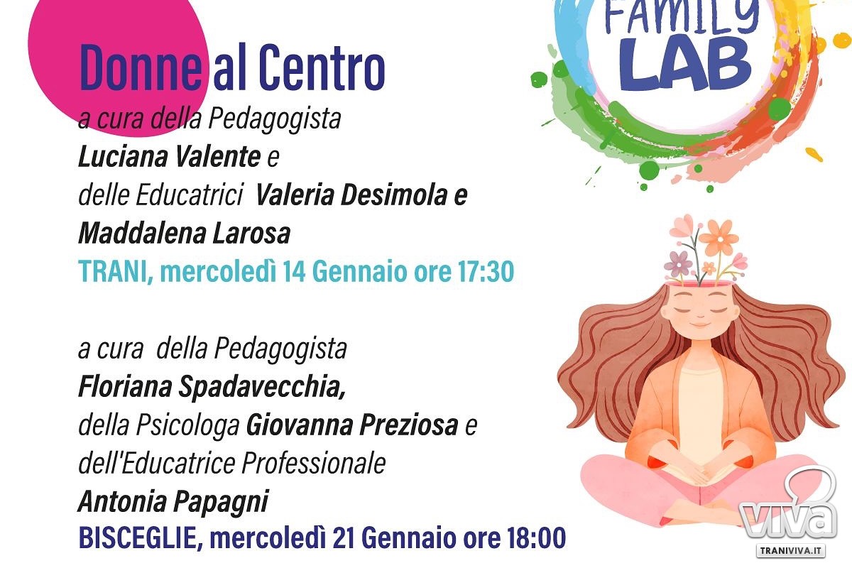 Come partecipare La partecipazione a tutte le iniziative del Family Lab è gratuita, ma è necessaria l'iscrizione per verificare la disponibilità dei posti in sala. Per informazioni last-minute o per prenotarsi ai prossimi appuntamenti, è possibile contattare il numero 0883 011094 o scrivere a familylabtrani@libero.it. Un'occasione da non perdere per tutte le donne che desiderano rimettersi "al centro", partendo proprio da oggi.