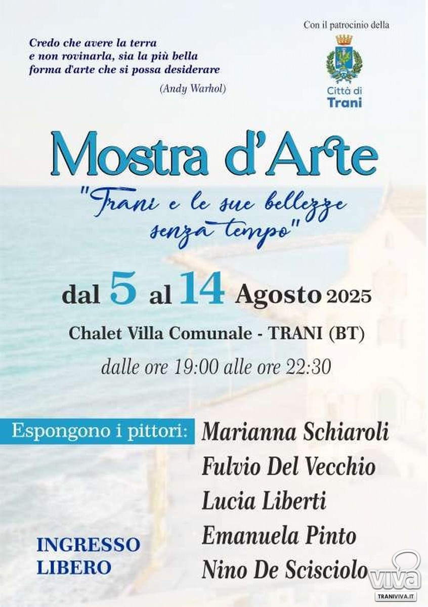 Con il patrocinio del Comune di Trani, l'iconico Chalet della Villa Comunale si è trasformato in una galleria d'arte a cielo aperto, e lo sarà fino al 14 agosto 2025, con la mostra "Trani e le sue bellezze senza tempo" che sicuramente incanterà cittadini e turisti, celebrando il fascino del territorio attraverso lo sguardo unico di cinque artisti locali. L'ingresso è libero e l'esposizione sarà visitabile ogni sera, dalle ore 19:00 alle 22:30.