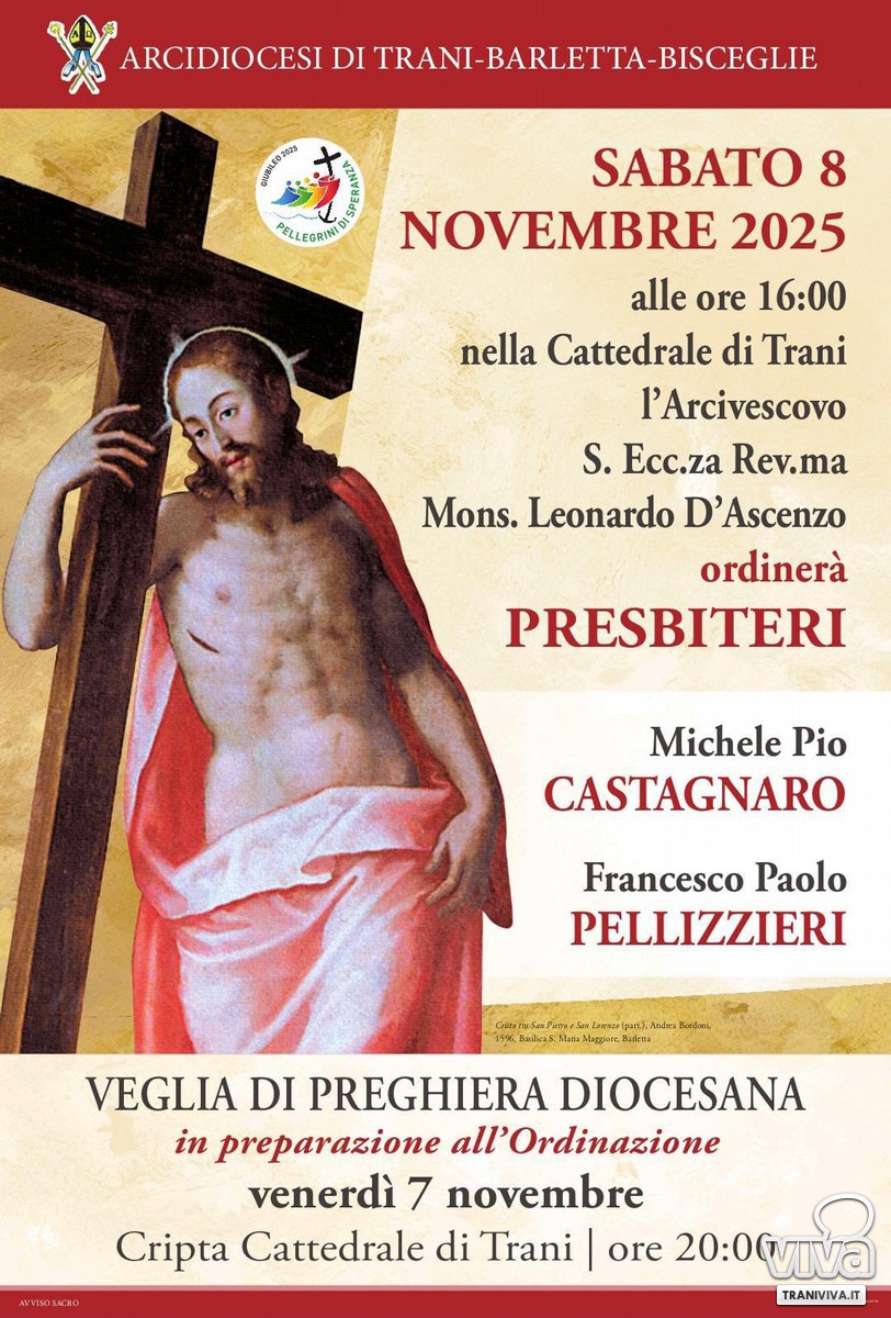 Sabato 8 novembre 2025, a Trani, nella Cattedrale, alle ore 16.00, durante una solenne celebrazione eucaristica presieduta dall'Arcivescovo mons. Leonardo D'Ascenzo, i diaconi Michele Pio Castagnaro e Francesco Paolo Pellizzieri saranno ordinati presbiteri. La celebrazione eucaristica sarà trasmessa in diretta televisiva su Easy Tv, canale 81. In preparazione all'ordinazione presbiterale, venerdì 7 novembre, nella Cripta della Cattedrale di Trani, allo ore 20.00, si terrà una veglia di preghiera diocesana presieduta dall'Arcivescovo