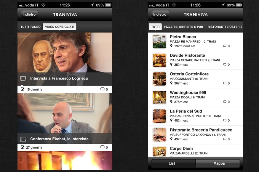 TraniViva App consente di consultare in mobilità, con l'immediatezza di un' interfaccia minimale a icone, tante sezioni del sito. Notizie, rubriche, contenuti sportivi e segnalazioni iReport sono consultabili sia aggregati per ordine di pubblicazione che per tipologia o per categoria (come cronaca, provincia, enti locali... questa è una novità di qualche ora). Inoltre i contenuti più consultati nell'ultima settimana sono raggruppati in un' apposita schermata. La ricca agenda di TraniViva ha una sezione dedicata: con gli appuntamenti ordinati cronologicamente è possibile conoscere in tempo reale tutti gli eventi sul territorio e c'è anche la possibilità di salvare i propri appuntamenti preferiti nel calendario personale dello smartphone. Grazie alle mappe e alla geolocalizzazione gps è possibile conoscere la distanza della location dell'evento a partire dalla propria posizione.