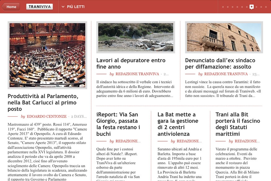 Ma le novità non finiscono qui: è già stata avviata al processo di validazione dello store di Apple la nuovissima TraniViva HD: la nostra nuova applicazione giornalistica con foto, video e contenuti pensata per iPad. Tutte le notizie di Trani in un app. Tra pochi giorni gratis su App Store.