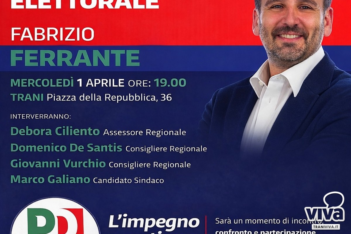 Si terrà mercoledì 1 aprile alle ore 19.00, in Piazza della Repubblica 36, l'inaugurazione del comitato elettorale di Fabrizio Ferrante. L'iniziativa rappresenta un momento di incontro, confronto e partecipazione aperto alla cittadinanza, con l'obiettivo di condividere idee, proposte e visioni per il futuro della città di Trani.