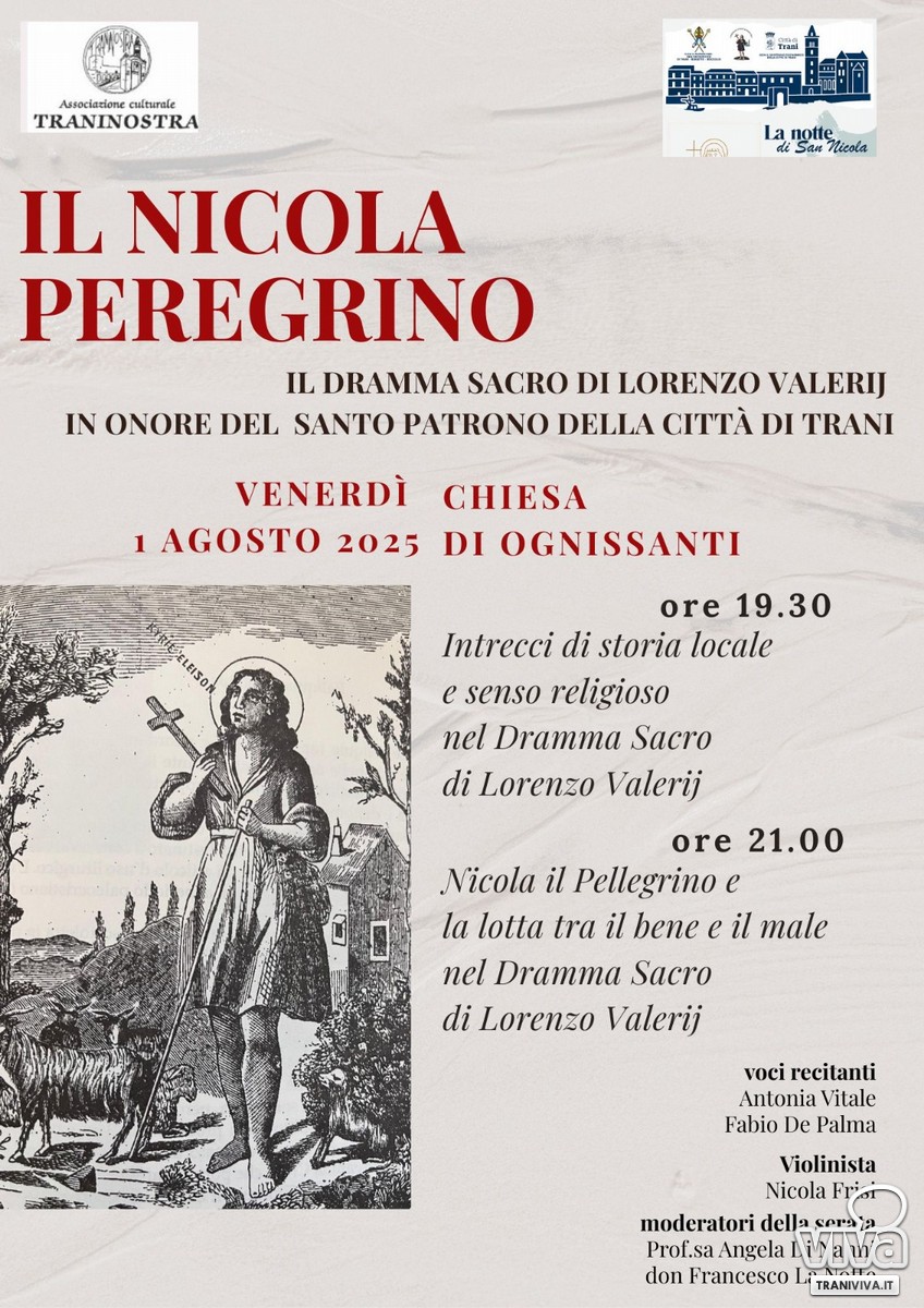 Domani, venerdì 1° agosto, nell'ambito della Notte di San Nicola organizzata dal Comitato Feste Patronali di Trani con l'Arcidiocesi di Trani-Barletta-Bisceglie e il Comune di Trani, si terrà un appuntamento speciale nel cuore del centro storico: nella splendida cornice della Chiesa di Ognissanti, gioiello nel cuore del porto , andrà in scena "Il Nicola Peregrino", dramma sacro del XVII secolo dedicato al Santo Patrono di Trani.