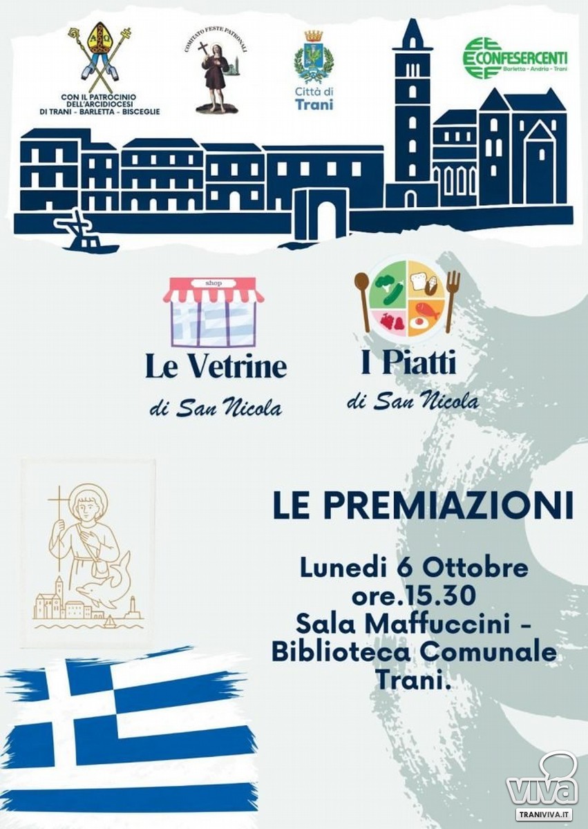 Il primo momento sarà dedicato ai contest "I Piatti di San Nicola il Pellegrino" e "Le Vetrine di San Nicola il Pellegrino". Promosse da Confesercenti in occasione della Festa Patronale, le sfide hanno coinvolto ben 30 attività commerciali e ristorative, chiamate a omaggiare il Santo Patrono con creazioni ispirate alla sua terra natale, la Grecia, e alle tradizioni tranesi. Una giuria premierà le tre migliori vetrine e i tre piatti più rappresentativi.