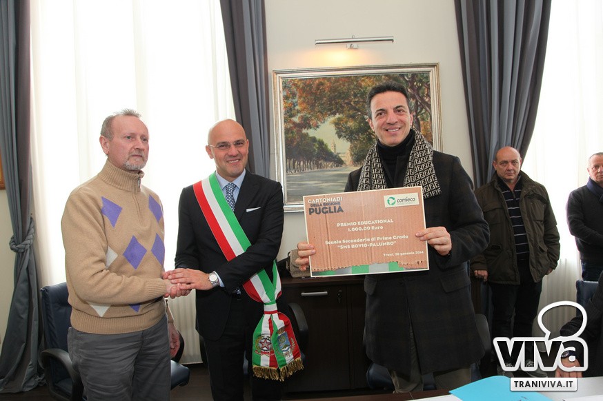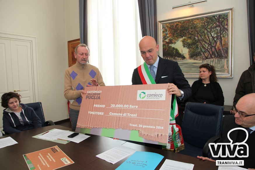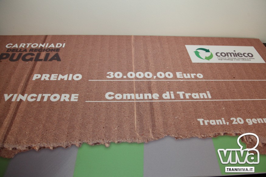 Le Cartoniadi della Puglia, che per un mese hanno visto sfidarsi a colpi di raccolta di carta e cartone ben 6 Comuni della Regione tra le Province di Bari e Barletta-Andria-Trani, hanno finalmente un vincitore: il Comune di Trani si è infatti aggiudicato il primo premio da 30.000 euro messo in palio da Comieco - Consorzio Nazionale Recupero e Riciclo degli Imballaggi a base Cellulosica. Il riconoscimento è giunto al termine della manifestazione che dal 18 novembre al 15 dicembre 2013 ha coinvolto circa 300.000 cittadini nei Comuni di Barletta, Bisceglie, Corato, Mola di Bari, Trani e Triggiano.
