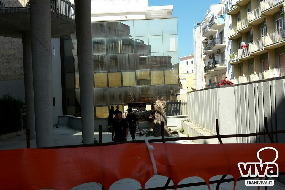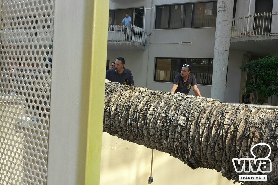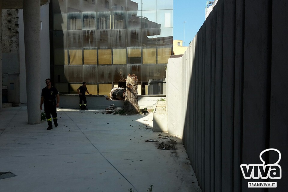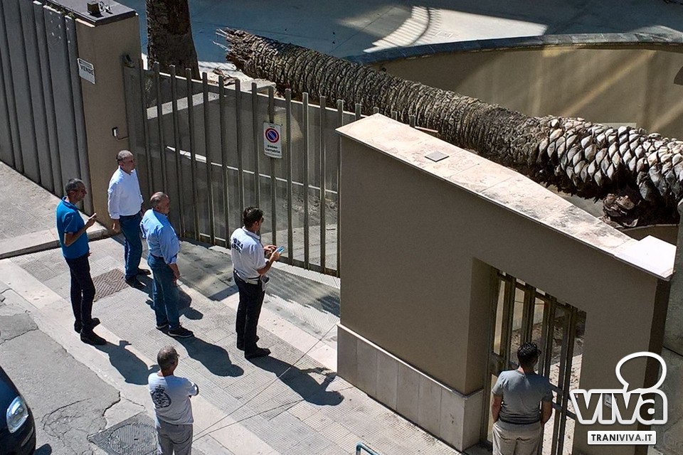 Un tonfo tremendo e la palma non c'era più. E' successo questo pomeriggio nel cortile del palazzo Amet di via Montegrappa, che ai primi due piani ospita la sezione Unep (gli ufficiali giudiziari) del Tribunale di Trani. Della maestosa palma che dominava il palazzo di quattro piani ormai non resta che un metro circa di tronco infisso nel terreno. Il resto è caduto giù. Dipendenti del Tribunale e finanzieri in servizio oggi pomeriggio hanno sentito un forte tonfo. Si sono precipitati fuori dall'edificio e hanno trovato la palma a terra. In quel momento l'edificio era quasi deserto e nessuno si è fatto male.