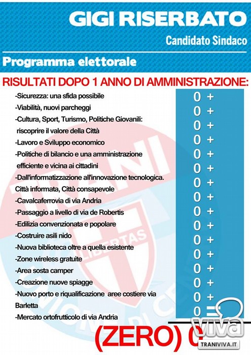 Il partito tranese ha preso in esame i punti del programma elettorale dell'attuale sindaco: sicurezza, viabilità e parcheggi, lavoro e sviluppo economico, innovazione tecnologica, cavalcaferrovia di via Andria, passaggio a livello di via de Robertis, nuova biblioteca, wi fi gratuito, area sosta dei camper, creazione nuove spiagge, riqualificazione dell'area costiera verso Barletta, mercato ortofrutticolo di via Andria. Queste sono alcune delle voci. E per ognuna l'Udc si è espressa senza mezzi termini: «Zero».