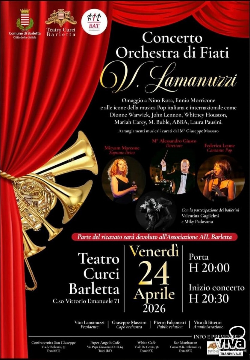 Non solo spettacolo: parte dell'incasso sarà devoluto all'AIL, a sostegno della ricerca e della lotta contro le leucemie. Un motivo in più per partecipare a un evento che unisce arte e impegno sociale. Apertura porte alle ore 20, sipario alle 20:30. Una serata che porterà sul palco del Curci non solo grande musica, ma anche un significativo legame con il territorio, con un pizzico di Trani tra i protagonisti.