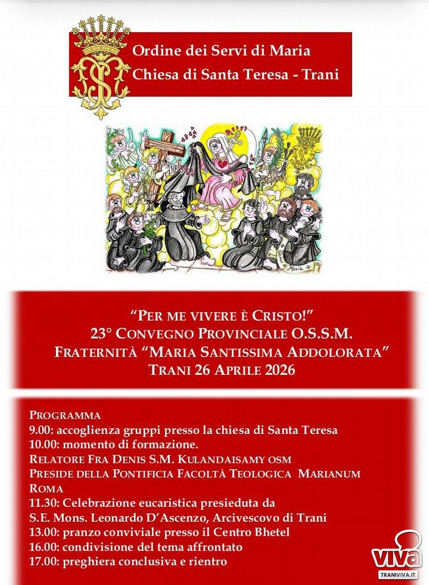 Il culmine delle celebrazioni sarà il 31 agosto 2026, data esatta del centenario, con una solenne Celebrazione Eucaristica preceduta dal Rosario, alla presenza delle principali realtà ecclesiali cittadine. In un tempo segnato da profondi cambiamenti, l'Ordine Secolare dei Servi di Maria continua a offrire un cammino autentico di fede, radicato nella tradizione ma aperto al presente. Il centenario diventa così non solo memoria storica, ma occasione concreta di comunione e rinnovamento spirituale per tutta la città di Trani.