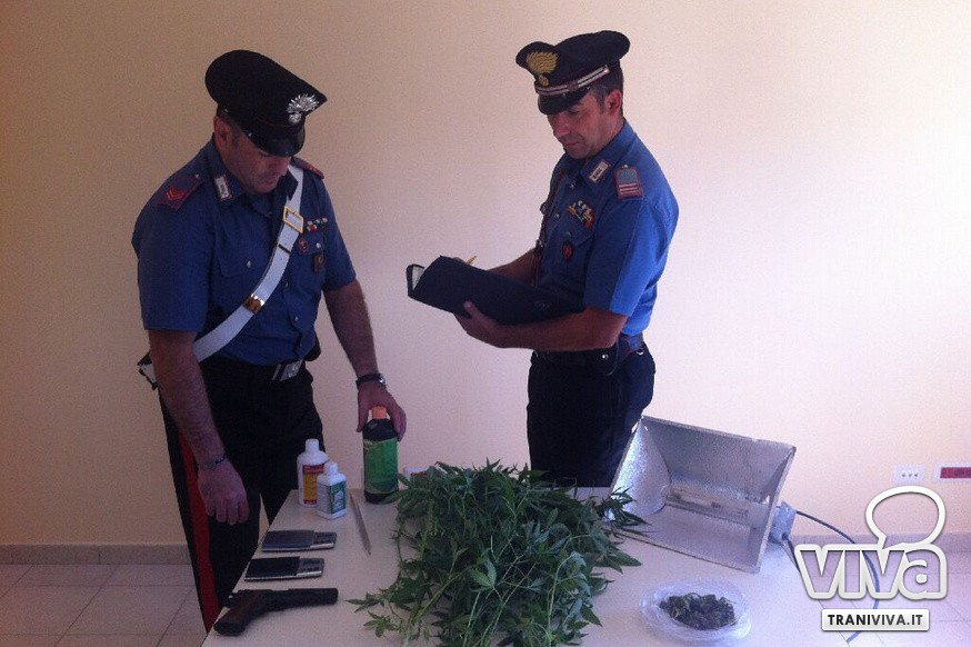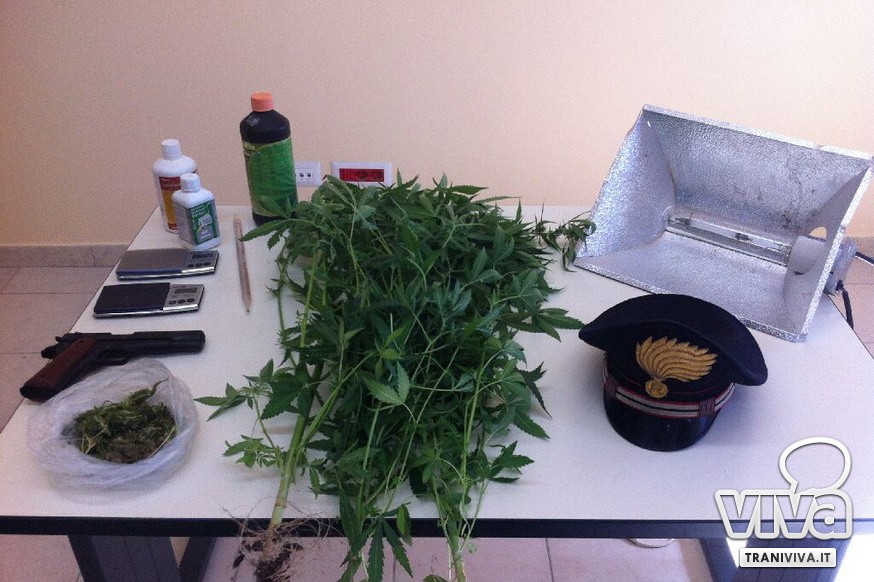 Nel corso di una perquisizione effettuata presso una piccola cantina, ubicata nel piano seminterrato della sua abitazione ed in suo uso esclusivo, gli operanti, aiutati da un'unità antidroga del Nucleo Cinofili Carabinieri di Modugno e da una squadra di Vigili del Fuoco di Molfetta, necessari per far aprire la porta metallica di accesso al locale, hanno rinvenuto una busta in cellophane contenente 48 grammi di marijuana, 2 bilancini elettronici di precisione, una pistola semiautomatica a salve e priva del tappo rosso, scovata sotto il cuscino di un divano. In un anfratto nascosto da una tenda, invece, sono state trovate tre piantine di canapa indiana, ben curate e alte circa 50 cm, tre barattoli di fertilizzante, un contagocce e una lampada alogena munita di condensatore, il tutto sottoposto a sequestro.