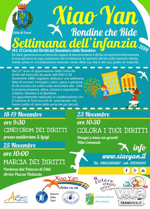 «Era il lontano 20 Novembre 1989 e finalmente l'Onu approvava la Carta Internazionale dei Diritti dei bambini e delle bambine. In 25 anni sono stati compiuti molti progressi e promosse infinite iniziative a favore dei più piccoli, ma dopo 25 anni ti accorgi che ancora molto c'è da fare». L'associazione Xiao Yan di Trani, in occasione della 25esima giornata mondiale dei diritti, ha organizzato, dal 18 al 25 novembre, un'intera settimana dedicata al mondo dei più piccoli.