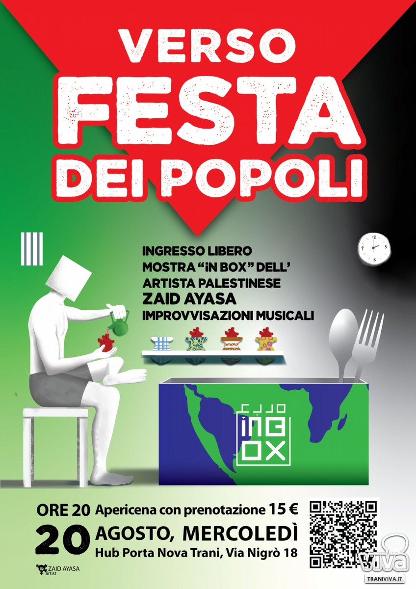"Verso Medea" è il primo appuntamento del percorso che porterà all'annuale Festa dei Popoli, mercoledì 20 agosto alle ore 20:00 presso HUB Porta Nova, Via Nigrò 18, Trani ci sarà l'inaugurazione della Mostra "In Box" di Zaid Ayasa con apericena etnica, su prenotazione, ed improvvisazioni musicali.