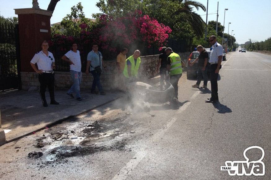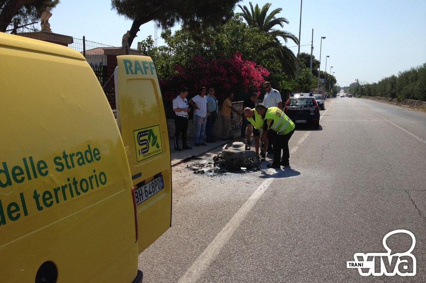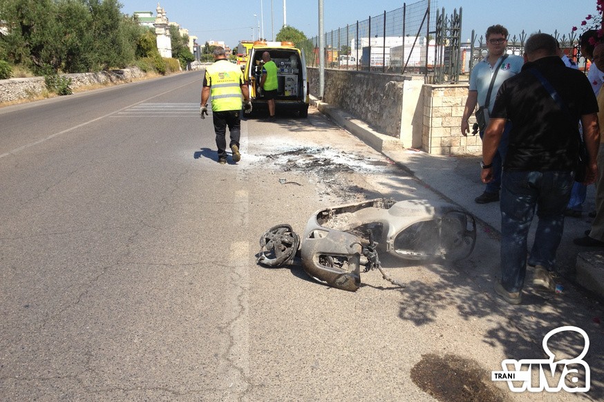 A causa di un'avaria, un ciclomotore ha preso fuoco mentre era in marcia. E' accaduto questa mattina, a Trani, su via Bisceglie, poco prima della seconda spiaggia. Non ci sono fortunatamente conseguenze per il motociclista che ha prontamente abbandonato il mezzo sull'asfalto. Sul luogo è intervenuta la Polizia Locale di Trani.