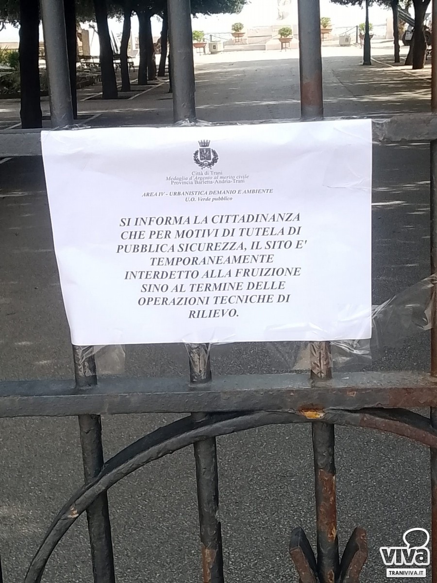 La Città di Trani ha disposto la chiusura temporanea della Villa Comunale per motivi di tutela e sicurezza pubblica, senza indicare la data di riapertura. L'avviso, diffuso nelle ultime ore, informa i cittadini che l'area resterà interdetta fino al completamento delle operazioni tecniche di monitoraggio. Il provvedimento si è reso necessario a seguito delle condizioni meteo avverse che hanno interessato il territorio nei giorni scorsi. Come spiegato dal vice sindaco Fabrizio Ferrante, è stata emessa un'ordinanza legata alla pericolosità di alcuni alberi, dopo che uno di essi è caduto nell'area giostre circa due giorni fa.