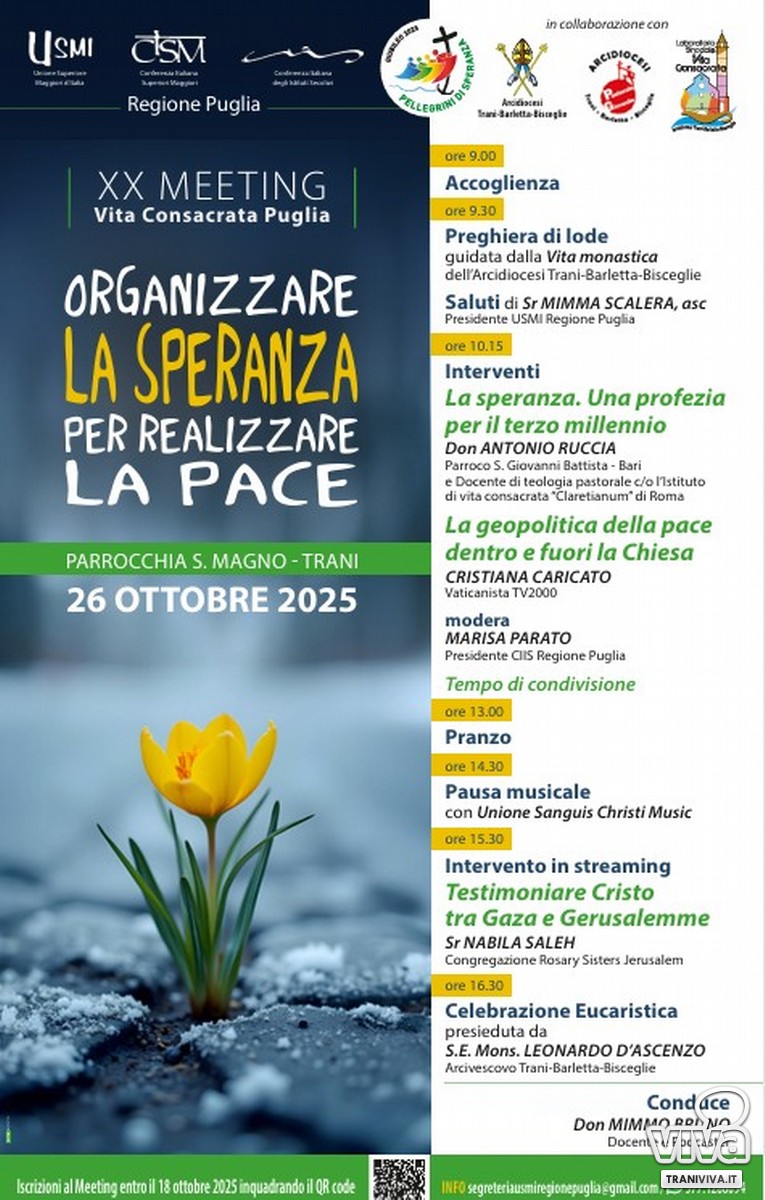 Il 20° incontro regionale delle persone appartenenti alla Vita Consacrata (come religiosi, suore, frati, monaci e membri di istituti secolari) della Puglia si svolgerà da oggi presso la Parrocchia San Magno di Trani, sarà un importante momento di riunione, riflessione e formazione per tutti i consacrati e le consacrate che vivono e operano nella regione.