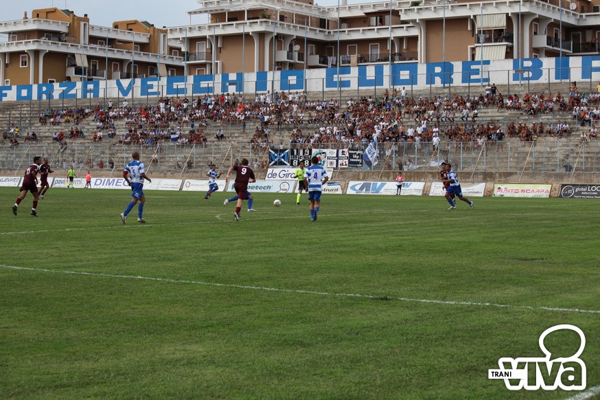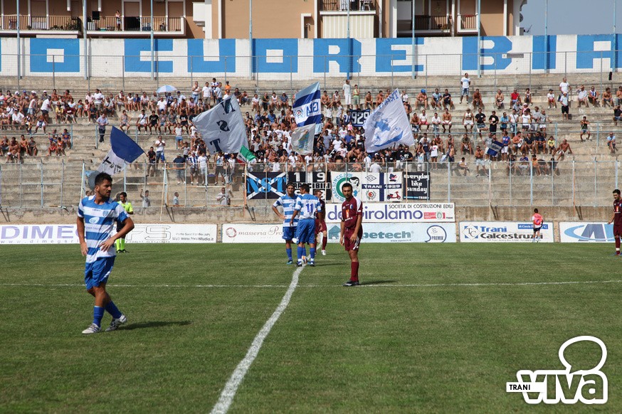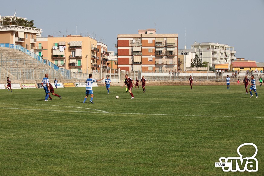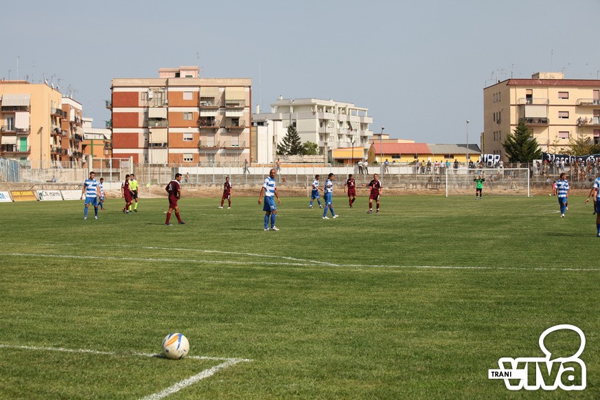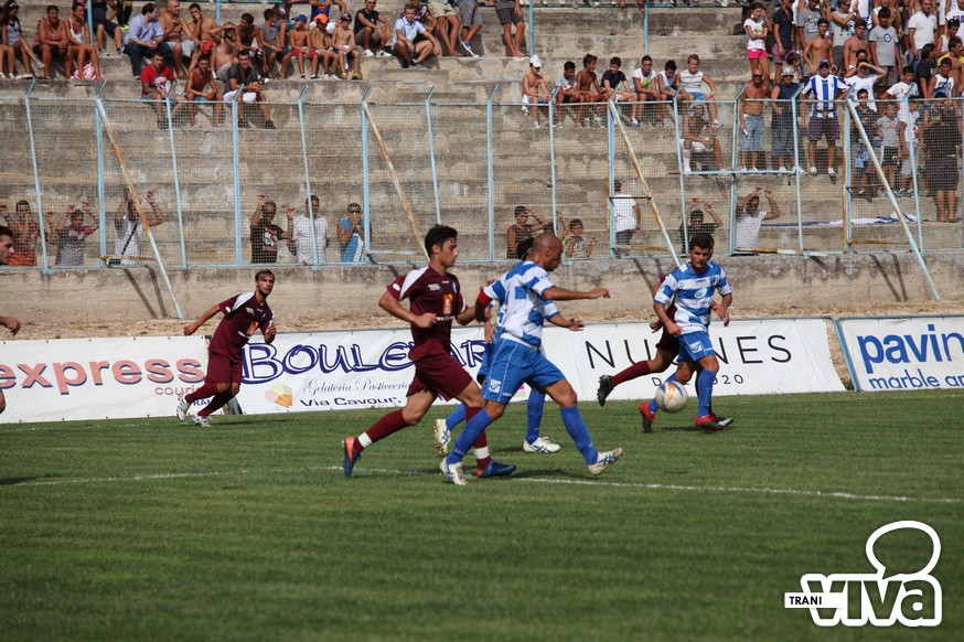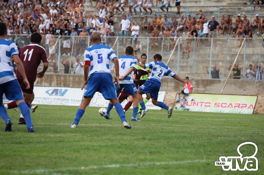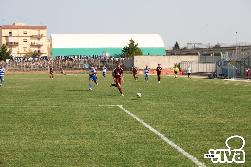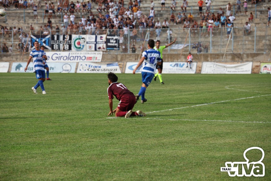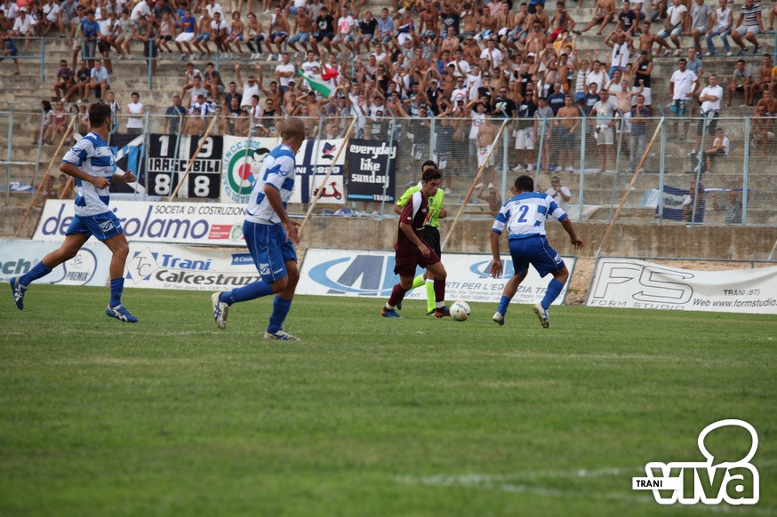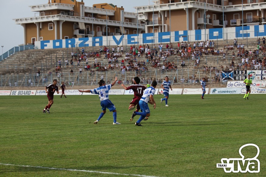 La prima frazione registra un discreto predominio territoriale del Trani (in maglia granata). La squadra di Dellisanti costruisce le due occasioni più nitide per sbloccare il risultato. Al 15' Cioffi di testa su azione d'angolo manda alto. Ben più grave l'errore di Guardabscio al 22'. L'attaccante si ritrova la porta spalancata dopo che Rasti aveva deviato sul palo una terrificante conclusione di Ferreyra dalkla distanza: palla fuori incredibilmente. Sarà questo uno degli episodi determinanti di tutto l'incontro.