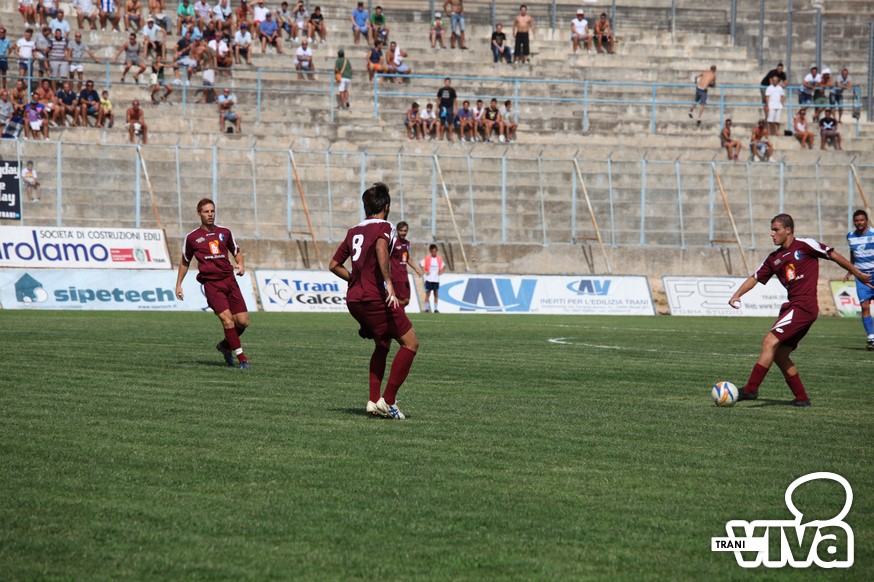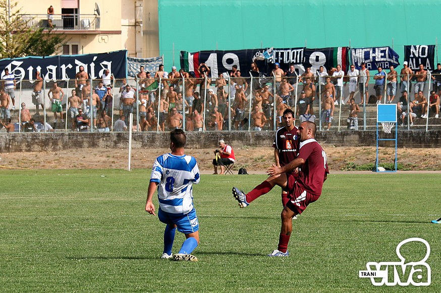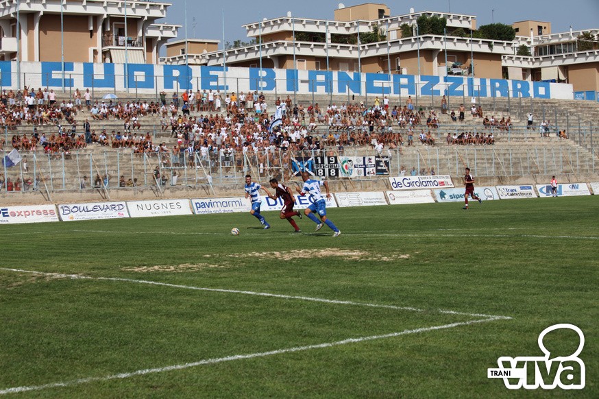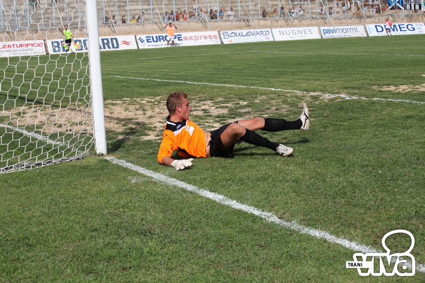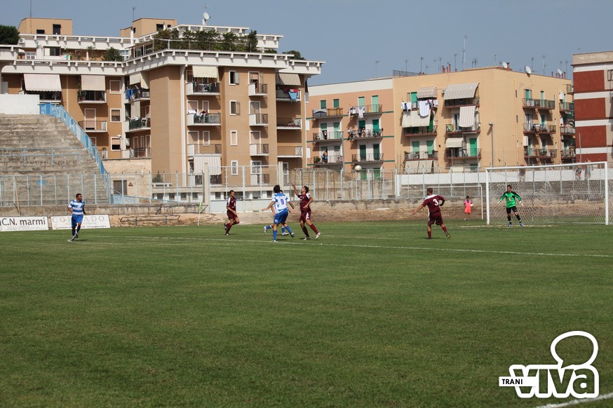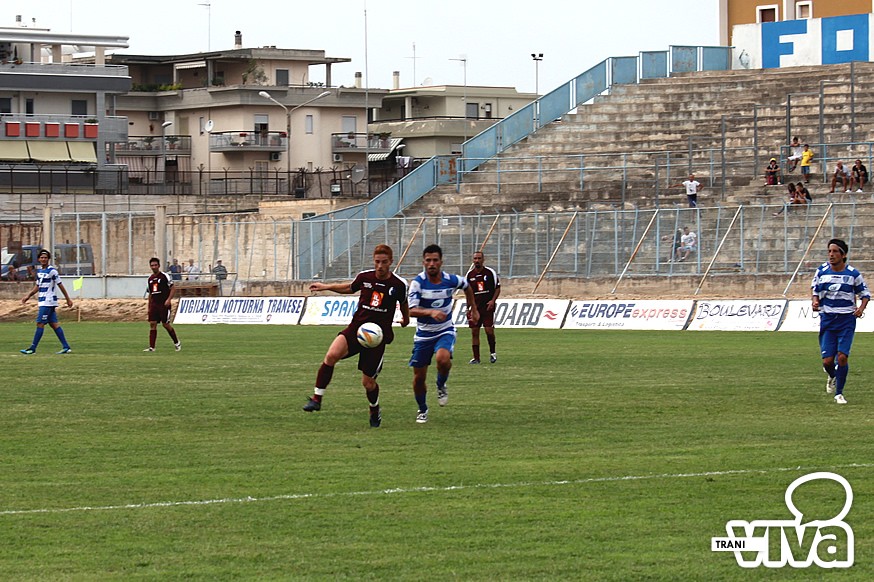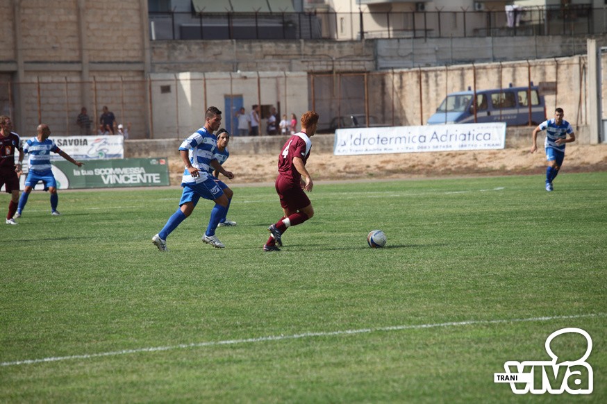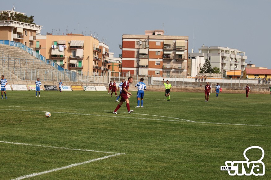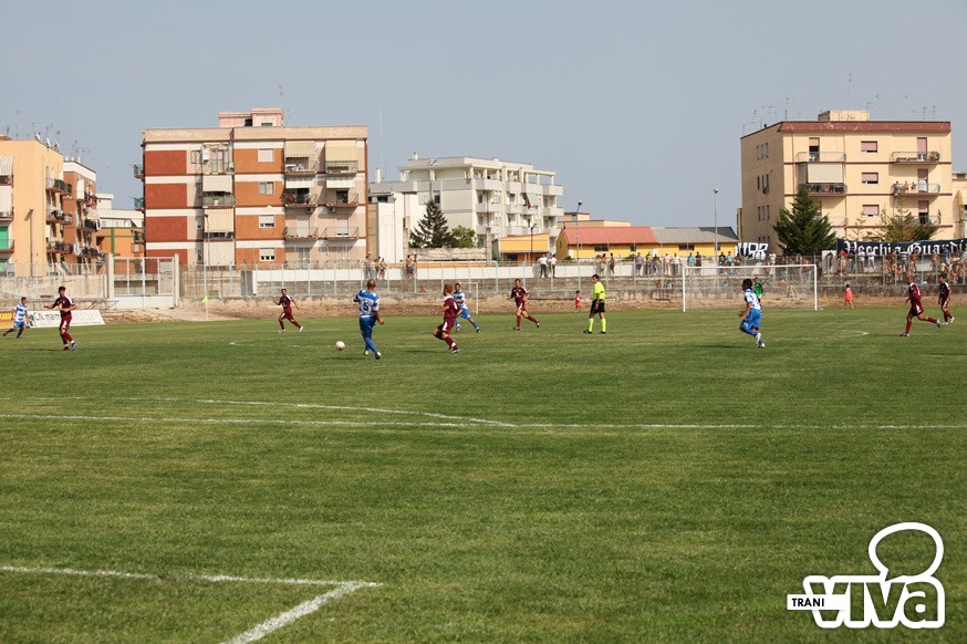 La prima frazione registra un discreto predominio territoriale del Trani (in maglia granata). La squadra di Dellisanti costruisce le due occasioni più nitide per sbloccare il risultato. Al 15' Cioffi di testa su azione d'angolo manda alto. Ben più grave l'errore di Guardabscio al 22'. L'attaccante si ritrova la porta spalancata dopo che Rasti aveva deviato sul palo una terrificante conclusione di Ferreyra dalkla distanza: palla fuori incredibilmente. Sarà questo uno degli episodi determinanti di tutto l'incontro.