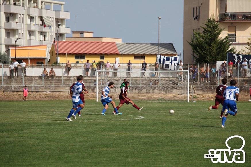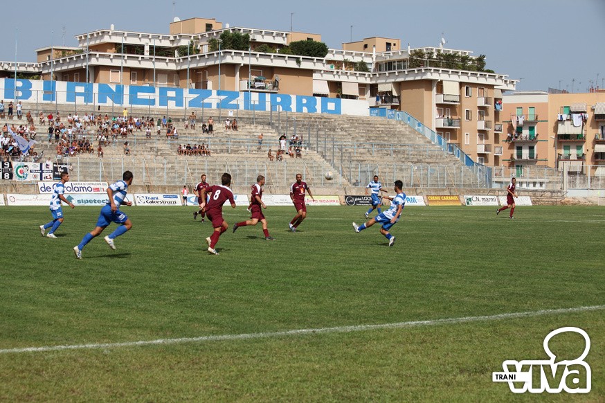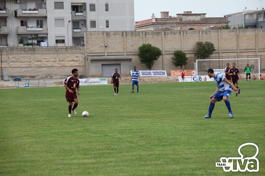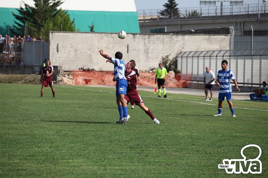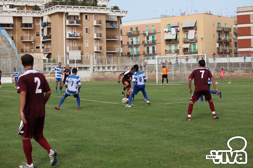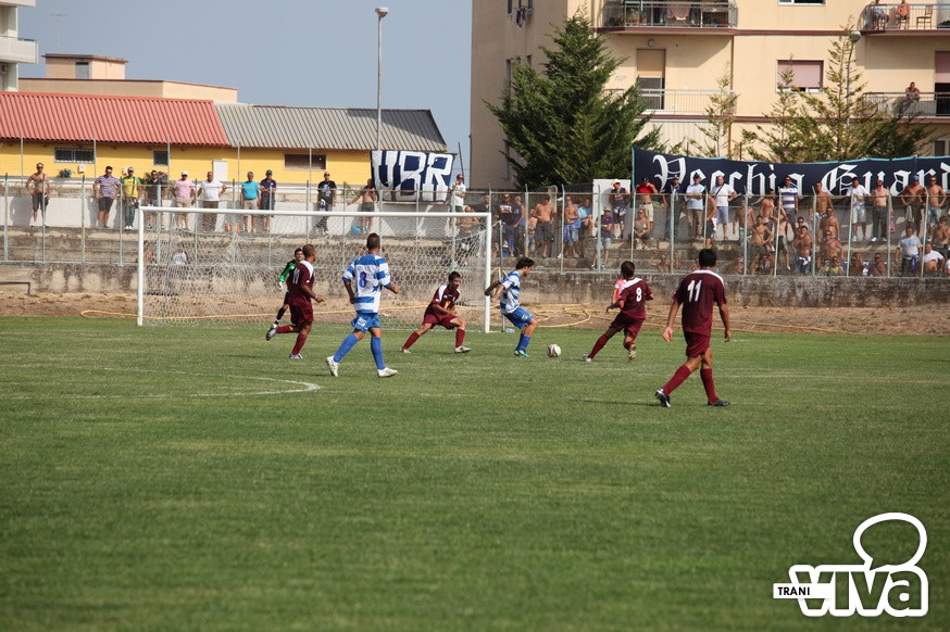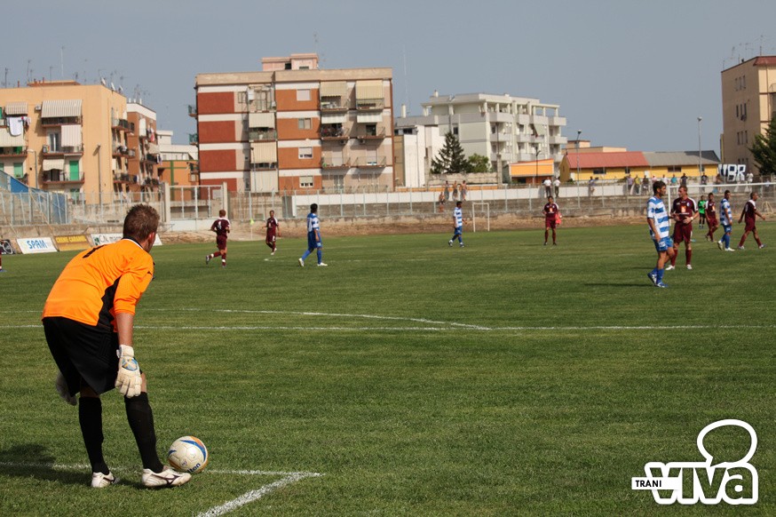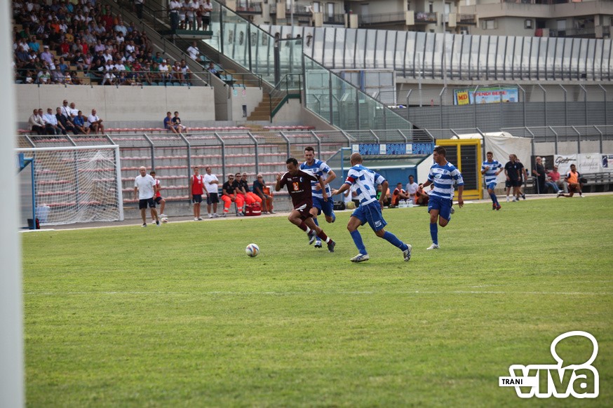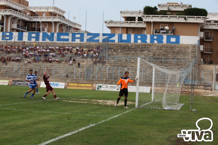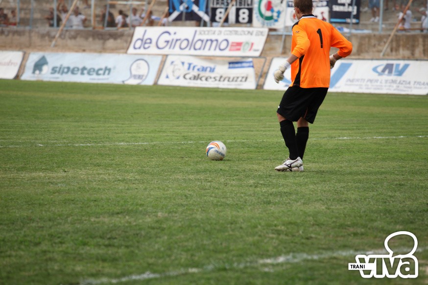 La prima frazione registra un discreto predominio territoriale del Trani (in maglia granata). La squadra di Dellisanti costruisce le due occasioni più nitide per sbloccare il risultato. Al 15' Cioffi di testa su azione d'angolo manda alto. Ben più grave l'errore di Guardabscio al 22'. L'attaccante si ritrova la porta spalancata dopo che Rasti aveva deviato sul palo una terrificante conclusione di Ferreyra dalkla distanza: palla fuori incredibilmente. Sarà questo uno degli episodi determinanti di tutto l'incontro.