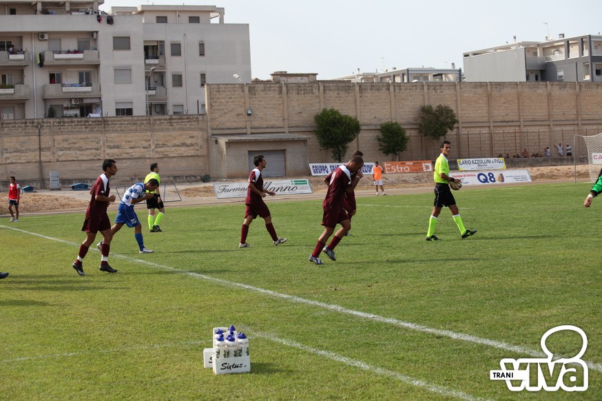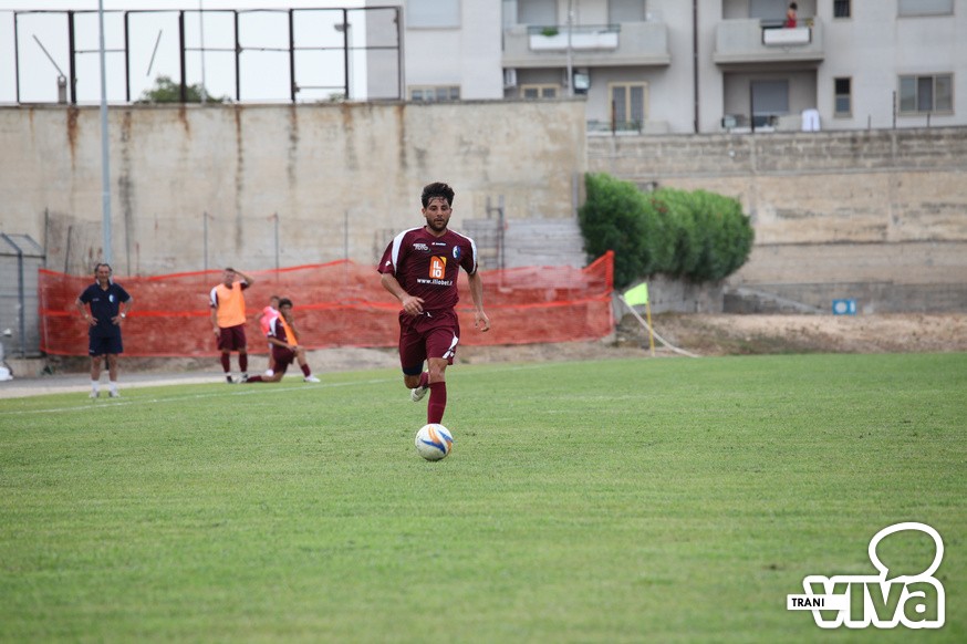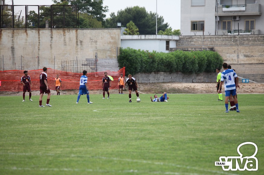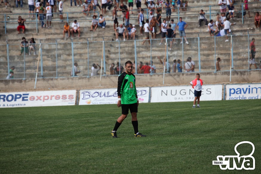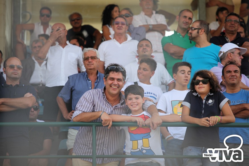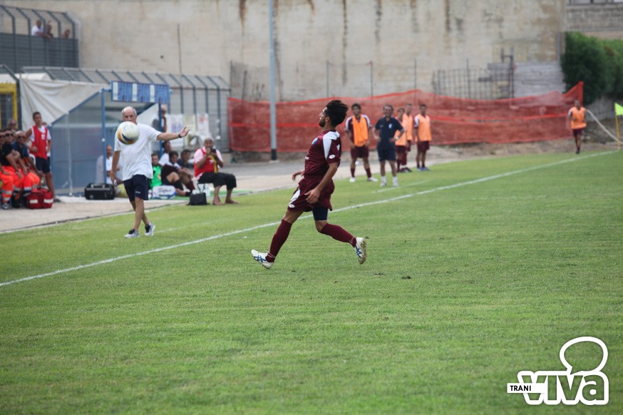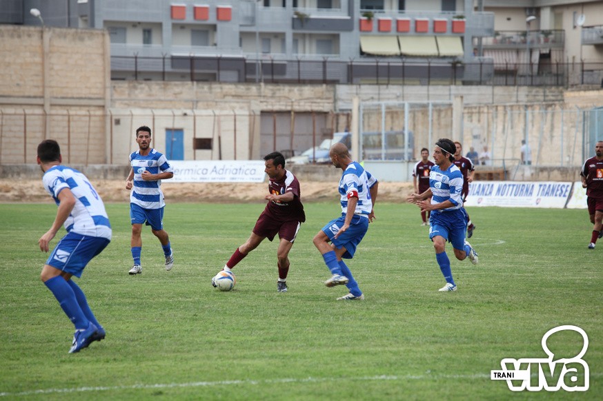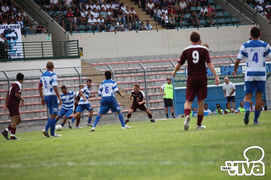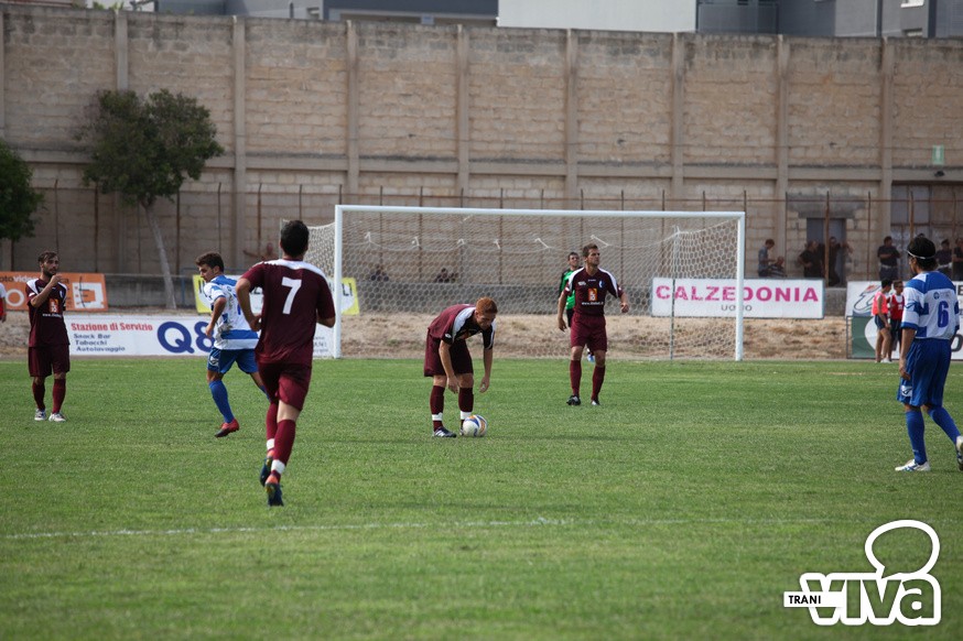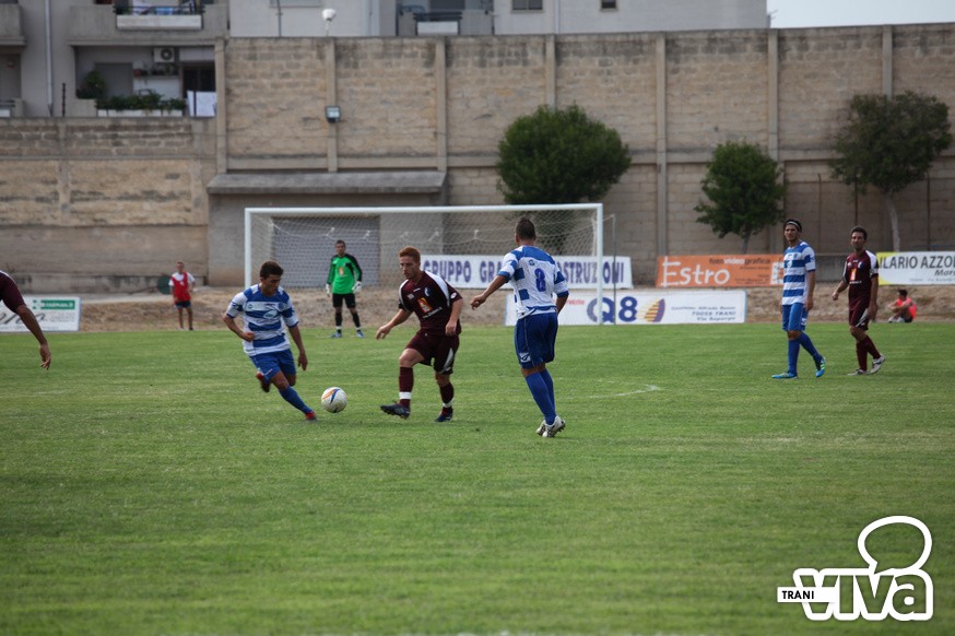 La prima frazione registra un discreto predominio territoriale del Trani (in maglia granata). La squadra di Dellisanti costruisce le due occasioni più nitide per sbloccare il risultato. Al 15' Cioffi di testa su azione d'angolo manda alto. Ben più grave l'errore di Guardabscio al 22'. L'attaccante si ritrova la porta spalancata dopo che Rasti aveva deviato sul palo una terrificante conclusione di Ferreyra dalkla distanza: palla fuori incredibilmente. Sarà questo uno degli episodi determinanti di tutto l'incontro.