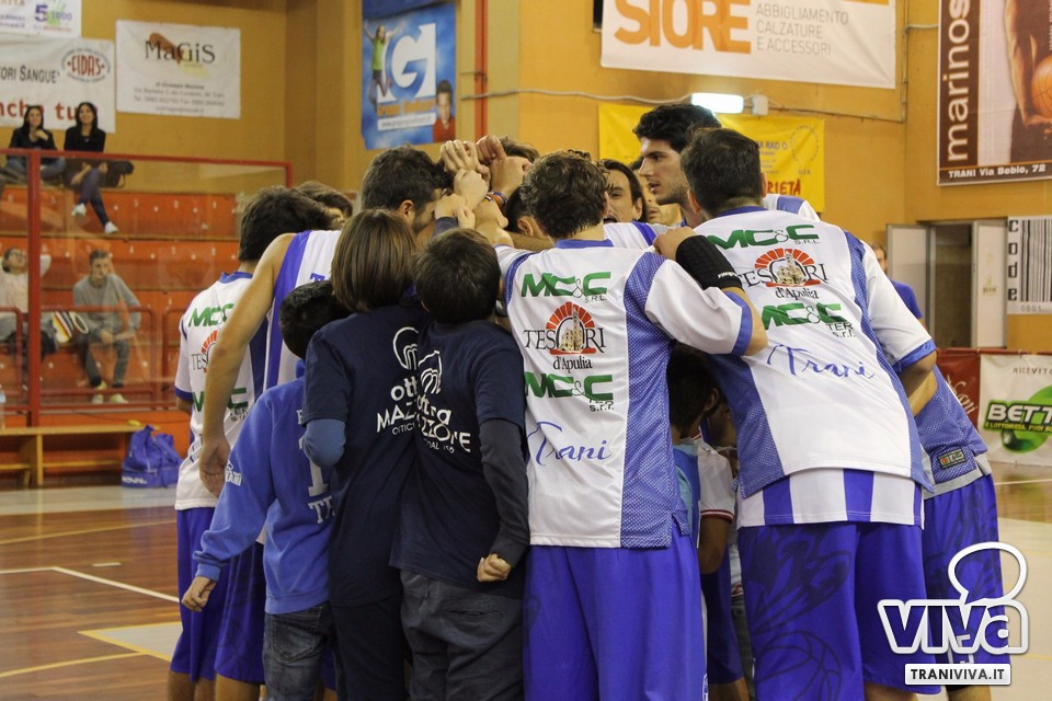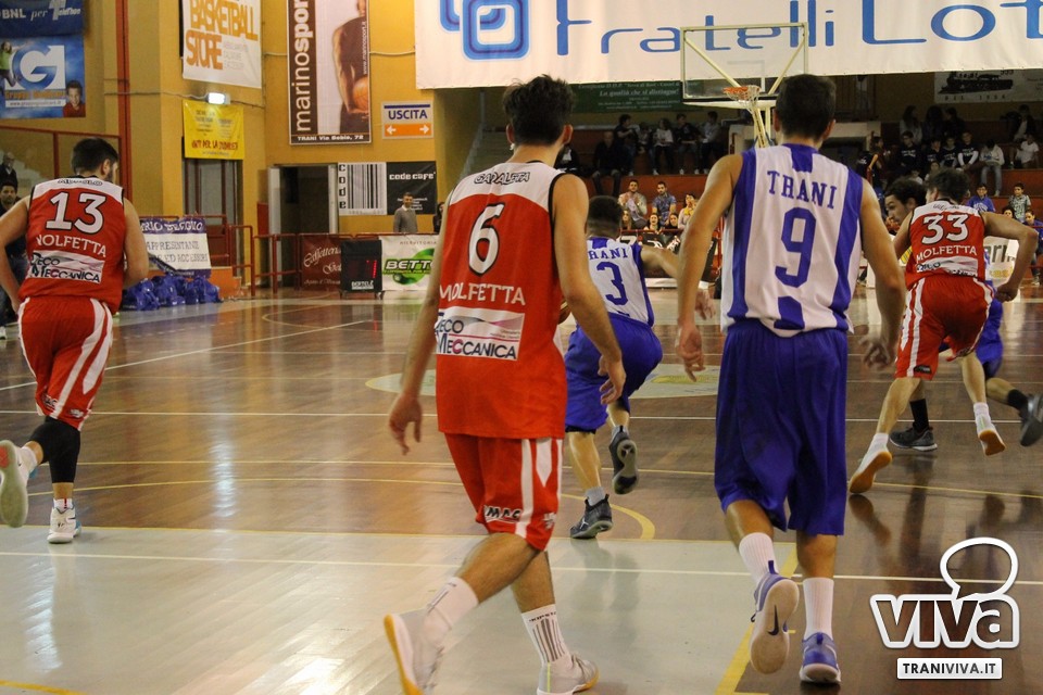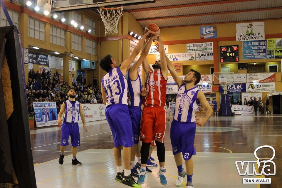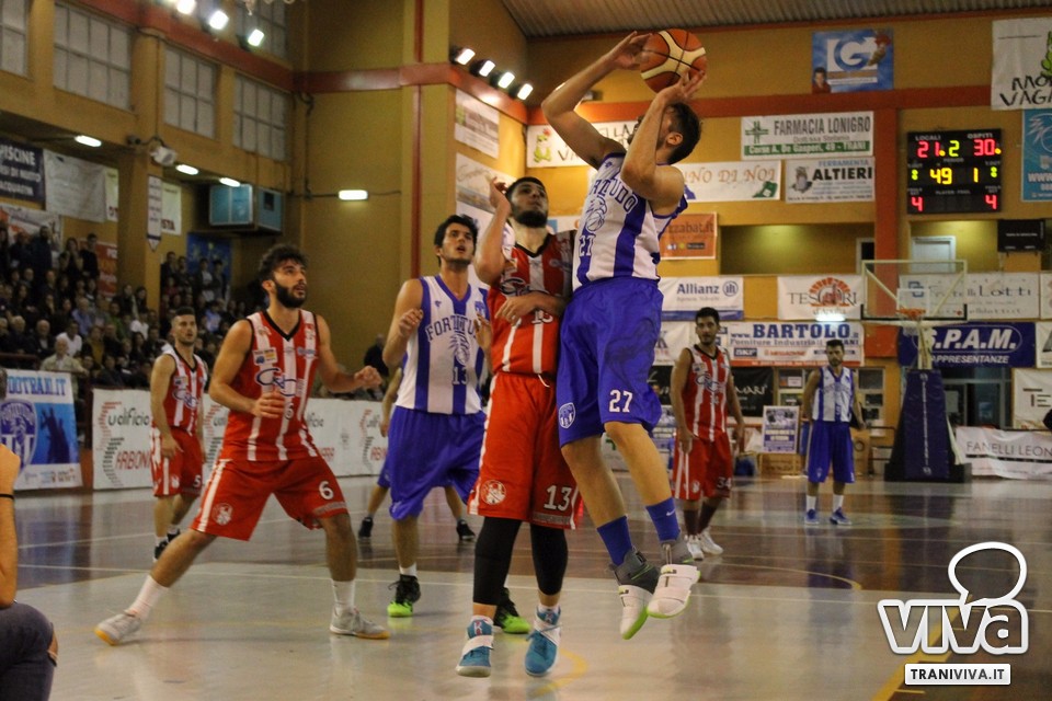 Il Trani mette in campo Tiani e Di Savino e sfodera la sua solita verve difensiva mettendo il Molfetta in seria difficoltà e lasciando poco spazio alle loro bocce di fuoco Maggi e Altamura che nel primo quarto hanno segnato il gap iniziale, annullandoli e tirandoli fuori dal gioco. Mavelli e Mennuni non sono in giornata di grazia e soffrono sotto canestro la presenza fisica dell'ex de Gennaro. La Fortitudo inizia a macinare gioco e a recuperare palloni con Di Lauro ma spesso lo sforzo difensivo non viene concretizzato. Nel finale di gara il Molfetta soffre e Trani tenta il tutto per tutto per riprendere la partita ma spreca beffardamente la palla del possibile over time e regala al Molfetta due punti. Resta il rammarico di una partita non giocata all'altezza o meglio di una partita non giocata affatto dai nostri ragazzi soprattutto per il Pala Assi ancora una volta gremito in ogni ordine di posto che non riesce a gioire per la prima vittoria ma applaude i suoi ragazzi e sicuramente li sosterrà domenica prossima nell'incontro casalingo contro il Cus Foggia.