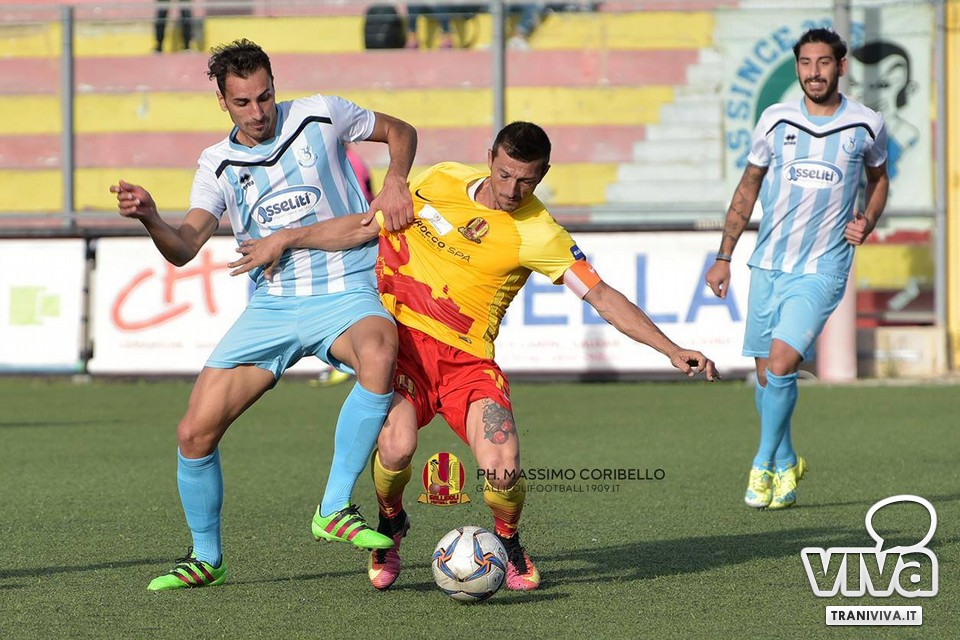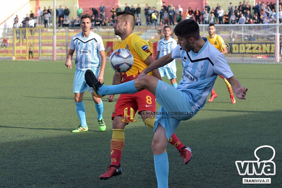 Un calcio di punizione di Sisalli è parato senza difficoltà, dall'altro lato un piazzato di Scialpi sorvola la traversa. Lo sgusciante Lavopa crossa da sinistra, la sfera è intercettata dal braccio di Greco: dal dischetto Faccini spiazza Passaseo esultando nei pressi degli entusiasti e passionali tifosi biancazzurri. Al 24' i padroni di casa arpionano la parità con Mingiano che da trenta metri sferra un fendente che si insacca all'incrocio tra lo stupore generale. Nella circostanza gli ospiti reclamano per un precedente fallo ai danni di Camporeale non sanzionato dal direttore di gara. Janko para una punizione centrale di Turco, sul capovolgimento è Faccini a provare un tiro dalla distanza che si spegne a lato.