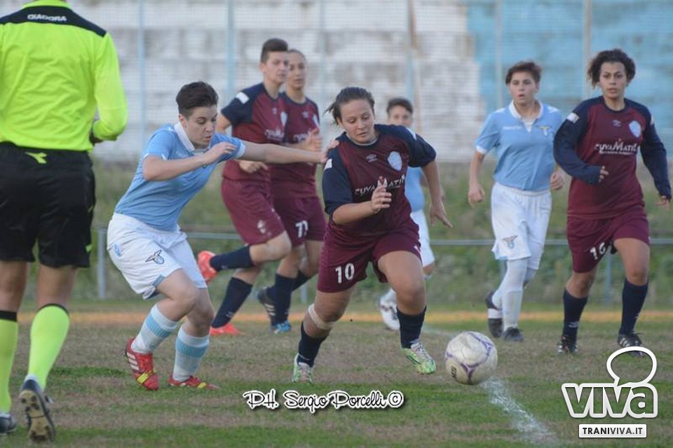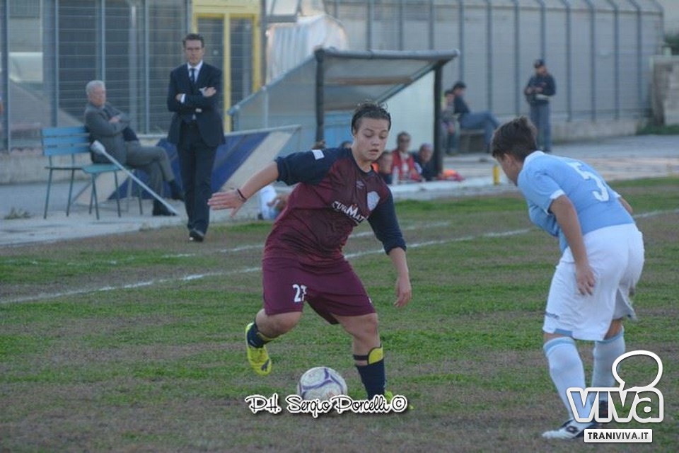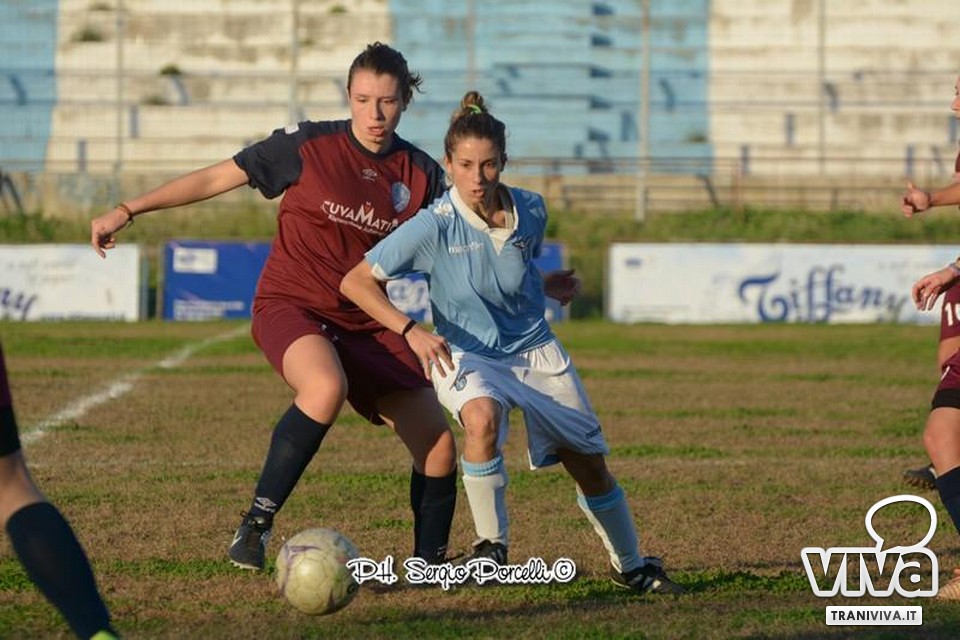 Domina il primo tempo ma non basta: l'Apulia Trani perde 1 a 0 contro la Lazio. La squadra di casa punta tutto su Mariano T., Spallucci, De Marinis, Chiapperini, Volpe, Iorio, Del Vecchio, Laurora, Sgaramella, Mariano P. e Cagiano. Le prime azioni sono già per l'Apulia: Del Vecchio tira su punizione, ma il portiere della Lazio para. Qualche tiro in porta anche di Mariano P. e un'ottima incursione di Sgaramella, una delle migliori in campo: tutto concentrato nei primi dieci minuti. Alla squadra ospite viene poi fischiato un rigore, per uno scontro di una ragazza laziale con Del Vecchio. Al venticinquesimo minuto, Mariano fa il miracolo: para il tiro del dischetto. Primo tempo 0 a 0.