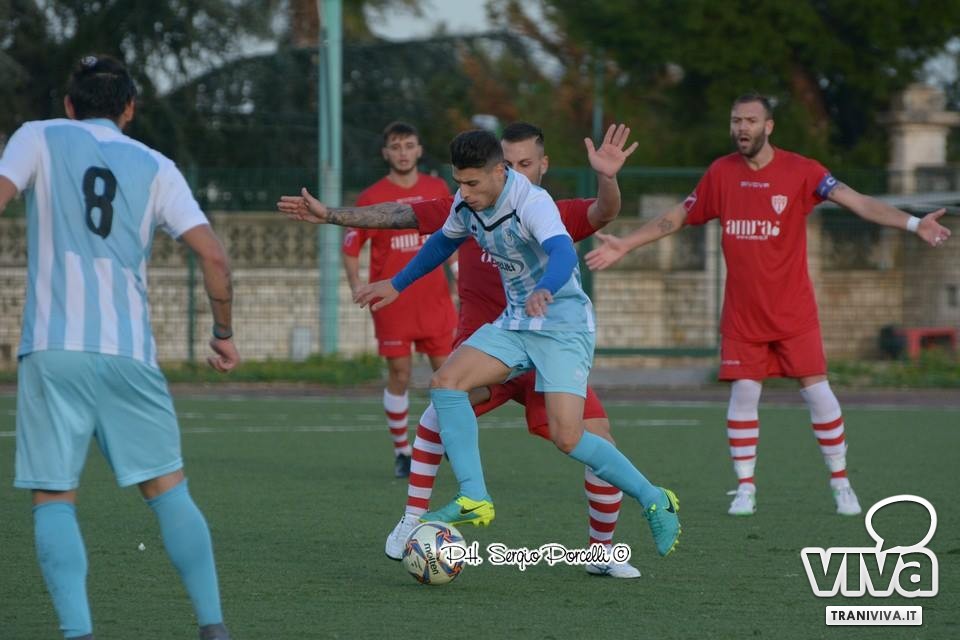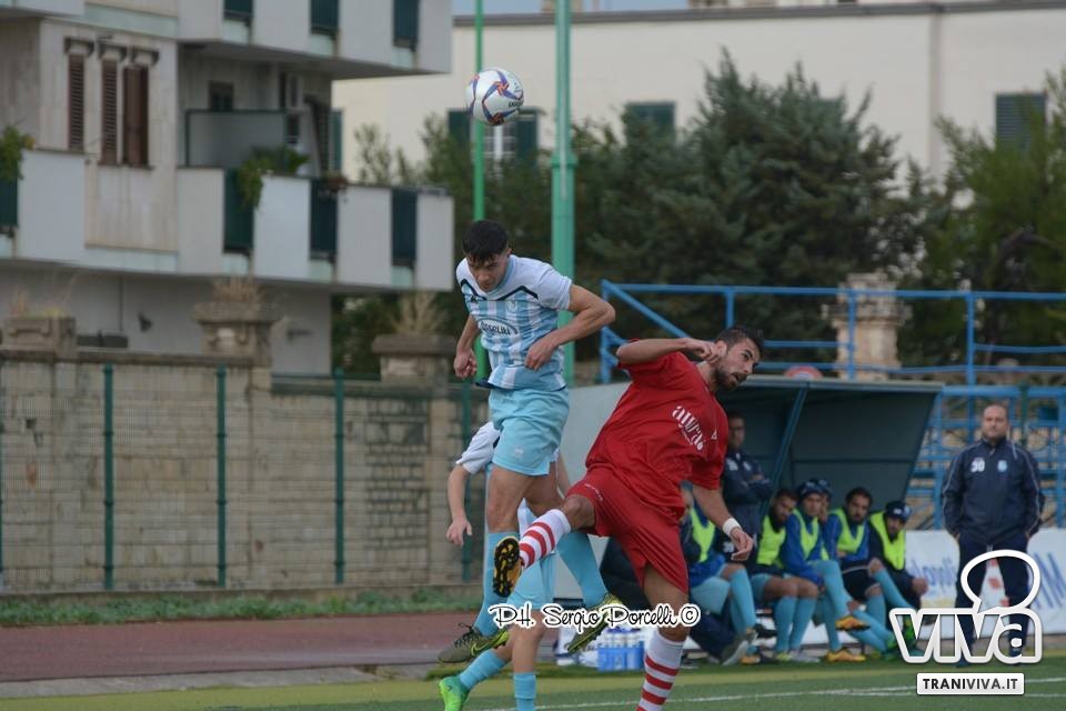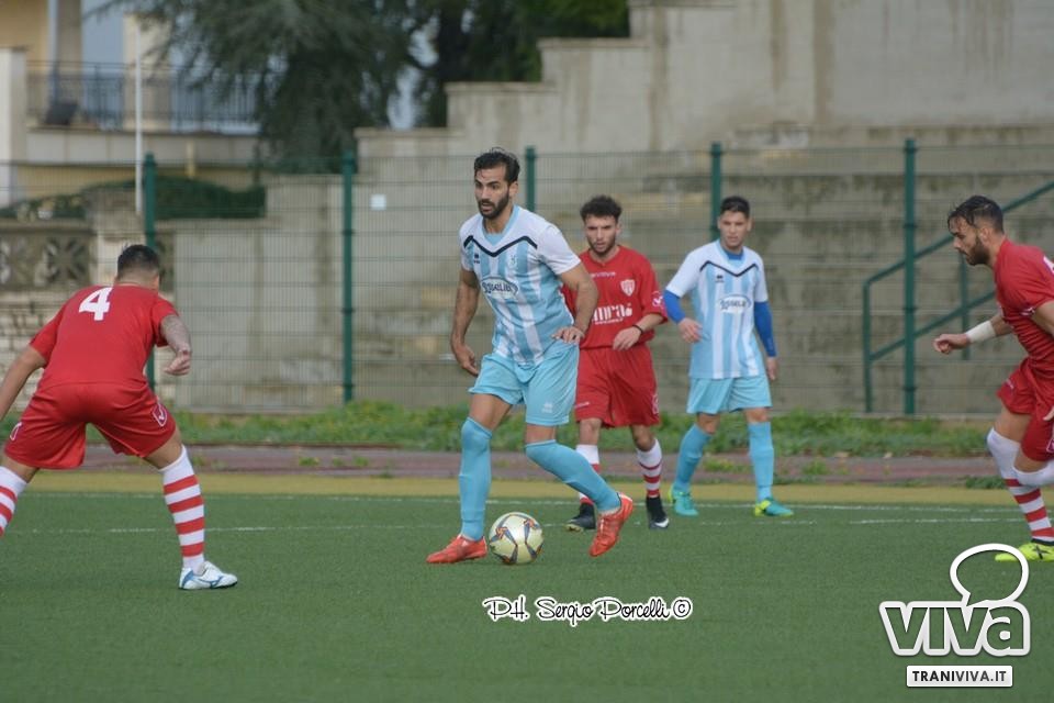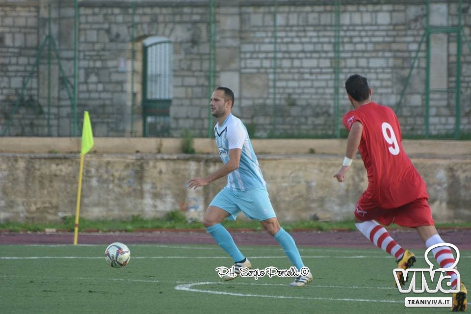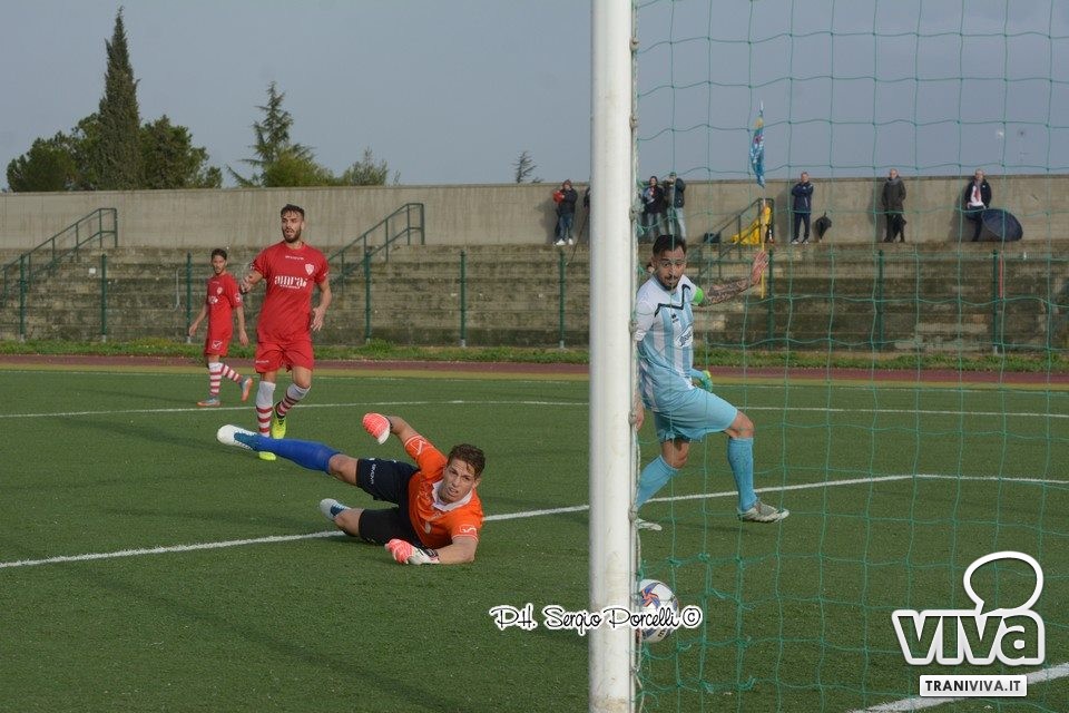 Una velenosa conclusione a giro di Infimo è deviata in corner da Festa, sull'altra sponda tocca ad Andriano cogliere la parte superiore della traversa con una perfida palombella dalla distanza. Dentamaro intercetta un invitante suggerimento dal fondo di Giacinto Martinelli destinato a miglior sorte, preludio all'occasione del 25' allorquando la soluzione mancina di Sisalli da fermo è prodigiosamente respinta dal giovane portiere molfettese. Il Trani (si rivede in campo Fernandez) non riesce a sfondare la linea difensiva di Giusto, nel frattempo prosegue il festival dei tiri franchi: Vitale, complice una deviazione della barriera, spaventa Sansonna; Camporeale lambisce il montante con un radente. Nei minuti di recupero lo scatenato Vitale si incunea in area concludendo verso la porta ma risulta provvidenziale il salvataggio di Valido, qualche istante dopo è lo stesso Vitale in azione solitaria a sfiorare il palo.