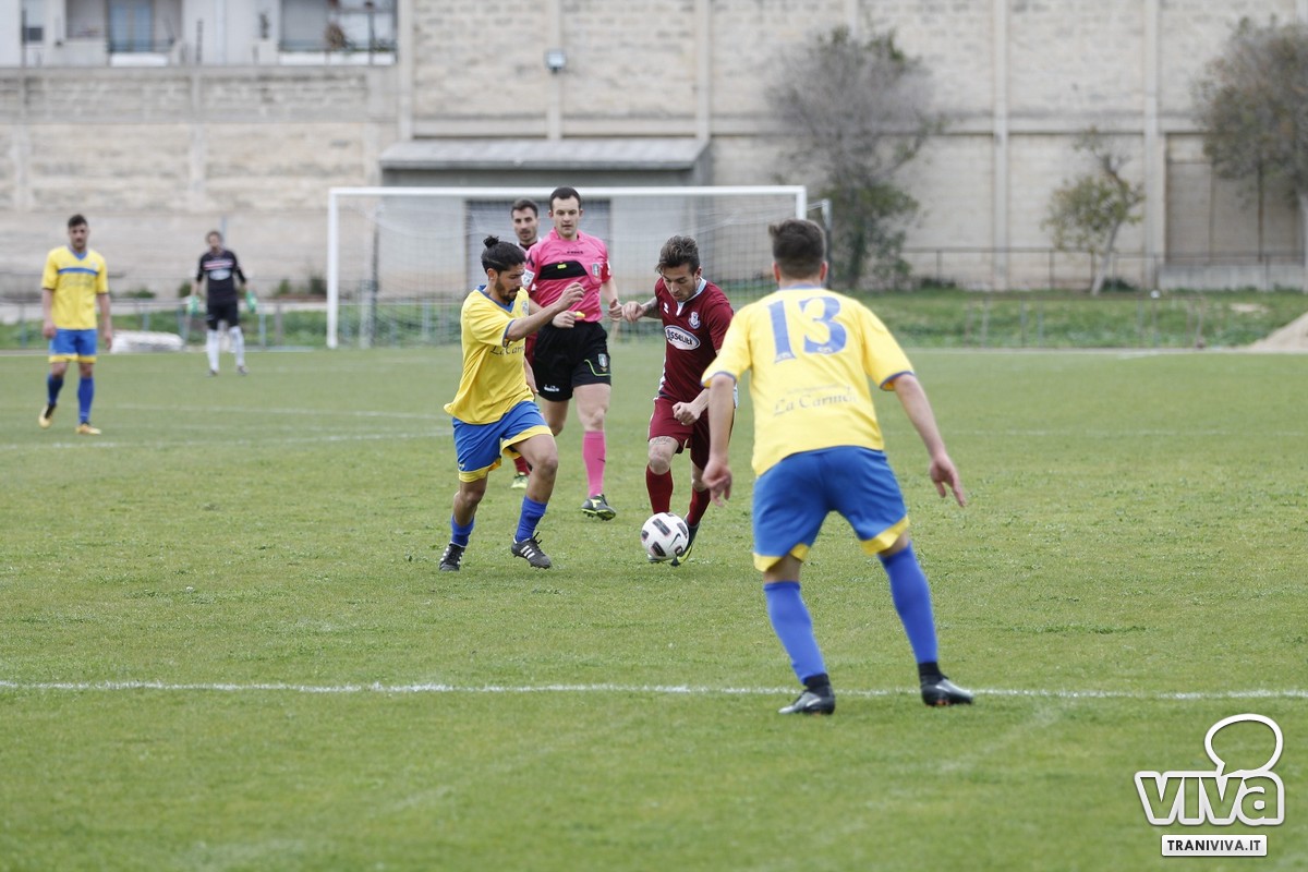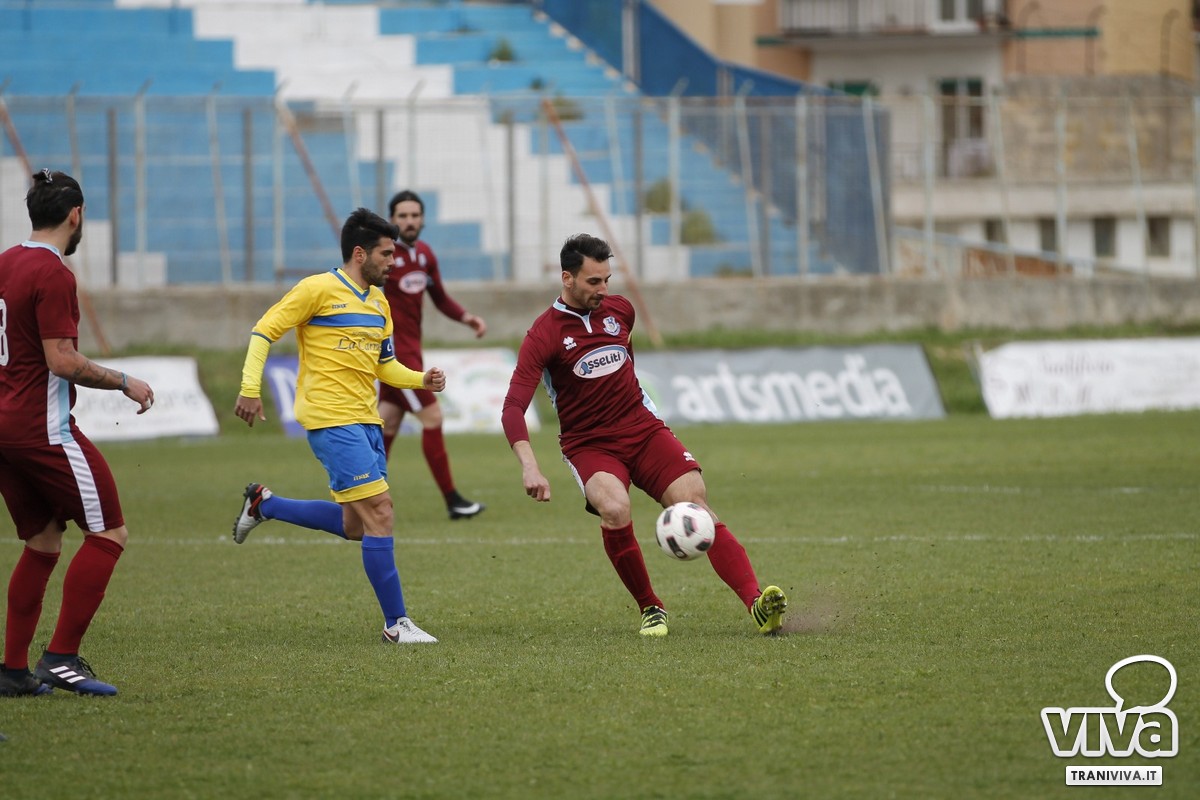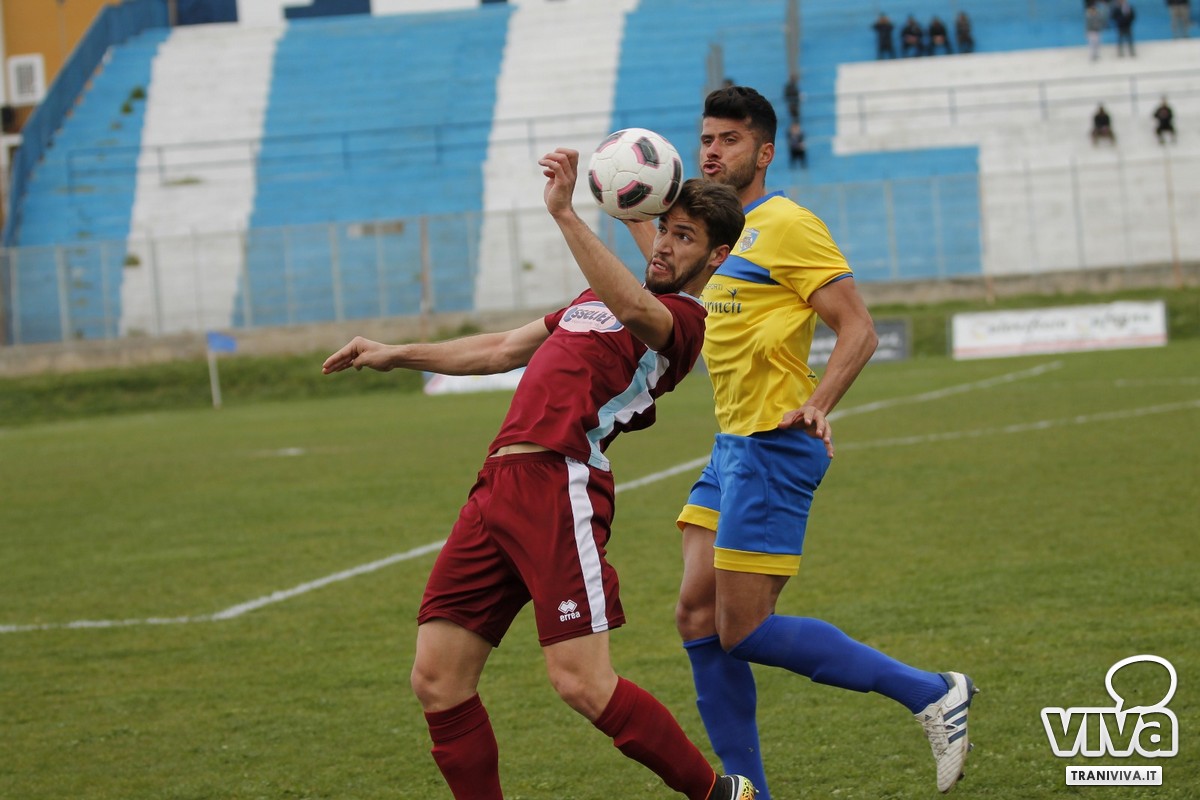 Ottima cornice di pubblico sugli spalti (presenti anche venti lodevoli ultras gialloblù in curva) nonostante la giornata feriale. Il primo guizzo è costituito da una rovesciata di Lorusso su sponda di Infimo che termina a lato. Riccobono disegna una traiettoria velenosa dalla bandierina costringendo Sansonna alla deviazione in angolo. Al 10' gli ospiti inseriscono la freccia: calcio piazzato di Riccobono, l'estremo locale si oppone al tentativo di Trevizan ma nulla può sulla ribattuta di Maltese in evidente posizione di fuorigioco (rilevabile ad occhio nudo e confermata dalle immagini); tra l'incredulità e le proteste biancazzurre il direttore di gara convalida la marcatura. Un'inzuccata di Bruno sugli sviluppi di un angolo chiama Iacono alla respinta mentre Cosentino sfiora l'autorete qualche istante più tardi. Al 32' matura il pareggio del Trani: Infimo appoggia a Martinelli che dall'out destro pennella perfettamente per l'accorrente Camporeale che scarica un'imparabile saetta all'incrocio. Nelle fasi conclusive opportunità per Lorusso che si fa murare la conclusione dal portiere in uscita.